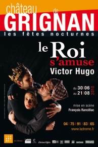 Depuis plus de 20 ans, le Département de la Drôme produit durant 2 mois, un spectacle de théâtre présenté dans devant la façade du château de Grignan, dans un cadre exceptionnel et dans des gradins offrant pas moins de 780 places. C’est cette année la pièce Le Roi s’amuse de Victor Hugo qui est mise à l’honneur. Ce drame étonnant, qu’on qualifierait aujourd’hui de « mélo », où le rire côtoie le terrible, se déroule à la cour de François 1er où Triboulet, un bouffon diabolique, mène une folle sarabande avant d’en être la victime…