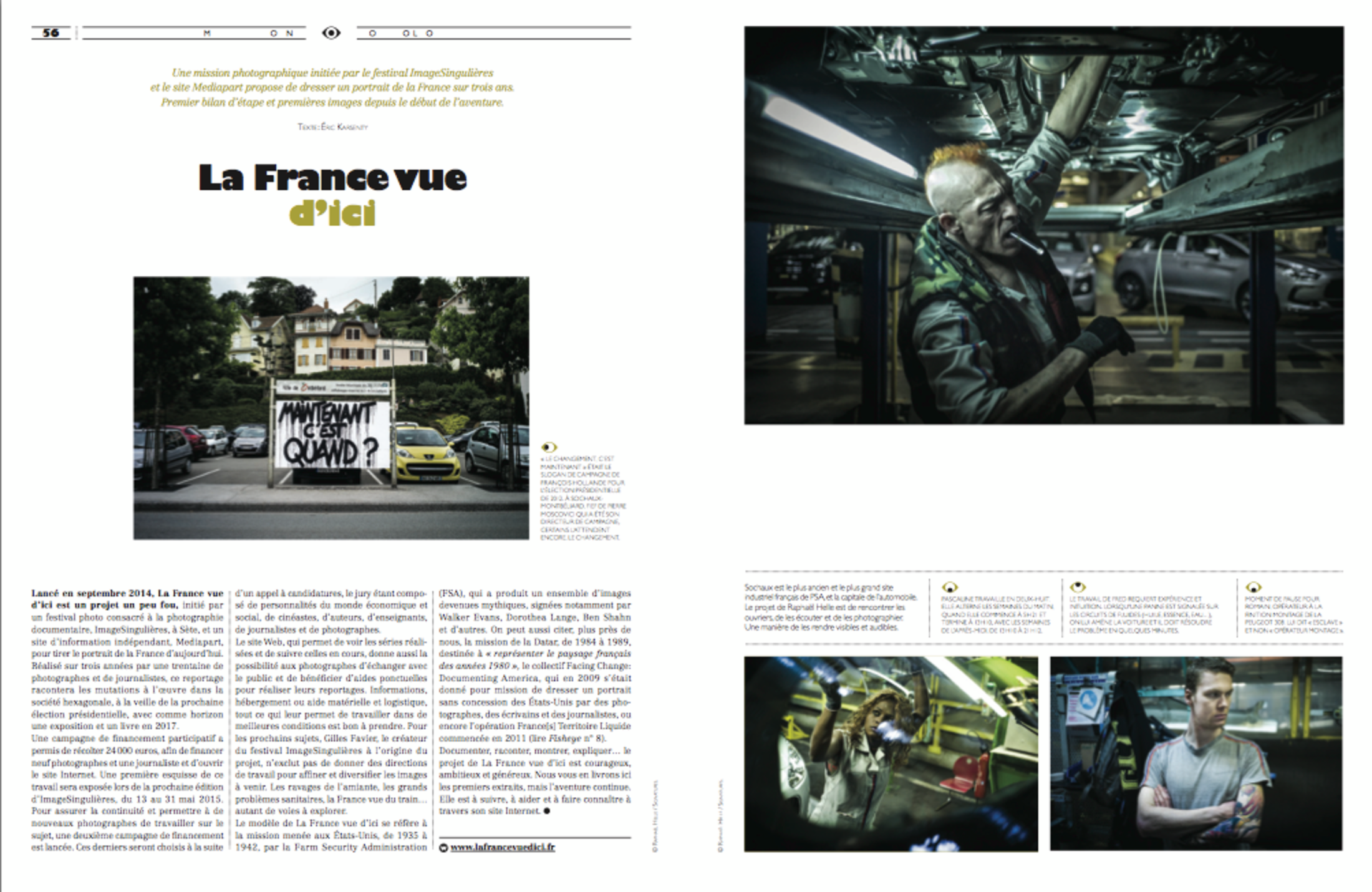 « Un projet un peu fou » peut-on lire dans ce magazine. Peut-être est-ce effectivement un peu fou d'imaginer 30 photographes sur les routes de France partis dresser le portrait du pays jusqu'en 2017, date de la prochaine échéance présidentielle ; de présenter ce travail au fur et à mesure de son développement sur un site internet ; d'espérer qu'un livre et une exposition pourraient clore ces trois ans d'enquête et montrer aux futurs candidats, la France qu'ils pourraient oublier... De se dire, surtout, que les photographes toucheront des droits d'auteur grâce aux dons d'internautes collectés sur le site KissKissBankBank.