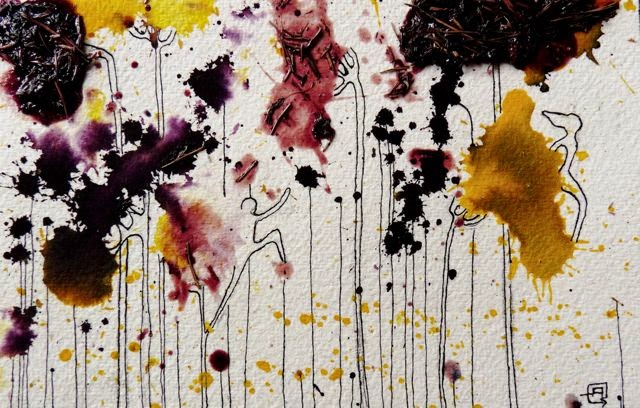 A Ceillac début juin, la foule des estivants n'était pas arrivée. Les passants se faisaient rares : un couple promenait une poussette, une femme songeuse laissait gambader son chien, quelques voitures roulaient au pas. A peu d'exceptions près, ce jour-là, ce grand pré n'accueillait guère d'humains sinon ceux qui arrivaient du ciel en se posant vent de face, par quelques pas courus, avec, dans leur sillage, une voile écarlate et des suspentes discrètes. Pour l'heure, ils étaient en plein ciel. J'avais refermé mes fioles d'encre et mon pot de liant pour mieux admirer ces gigantesques papillons à l'aile unique. Sur la plus grande de mes feuilles, séchaient ensemble mes bouts de route et mes couleurs. Demeurait une nouvelle page blanche, d'un format plus petit. Le nez planté au ciel, je savais qu'il me fallait m'occuper de celle-ci ; le temps, sinon, me manquerait pour le séchage. Lire la suite et voir les autres œuvres