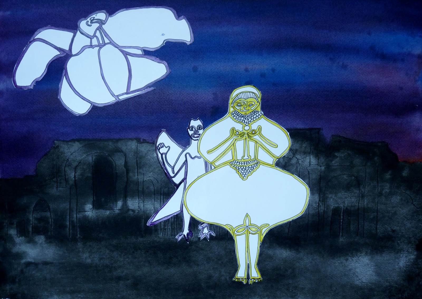 Je crus me souvenir qu'on avait retrouvé ici, une amulette du démon des démons des vents - le dénommé Pazuzu - et je me demandais si lui et son dragon étaient pour quelque chose dans cette folie destructrice. J'appris par la suite que cette soit-disant découverte était un fake, le fruit de l'imagination d'un scénariste des années 1970... Qu'importe, il y avait eu destruction de Hatra et j'avais besoin de faire renaître la cité parthe sur ma feuille de papier.