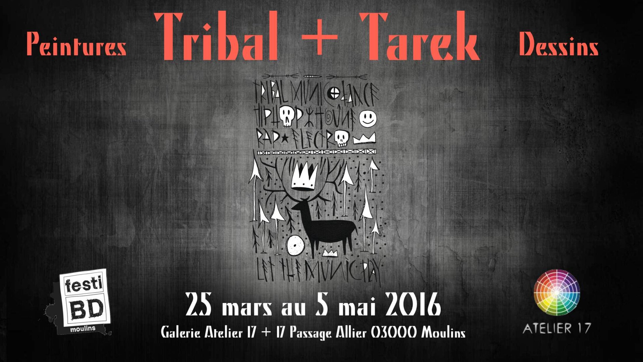 Nouvelle exposition de Tarek à la galerie Atelier 17 de Moulins où il présentera ses dernières réalisations dans la série Tribal (dessins + peintures).