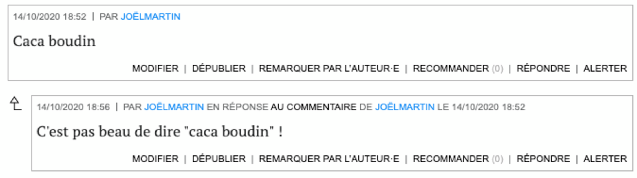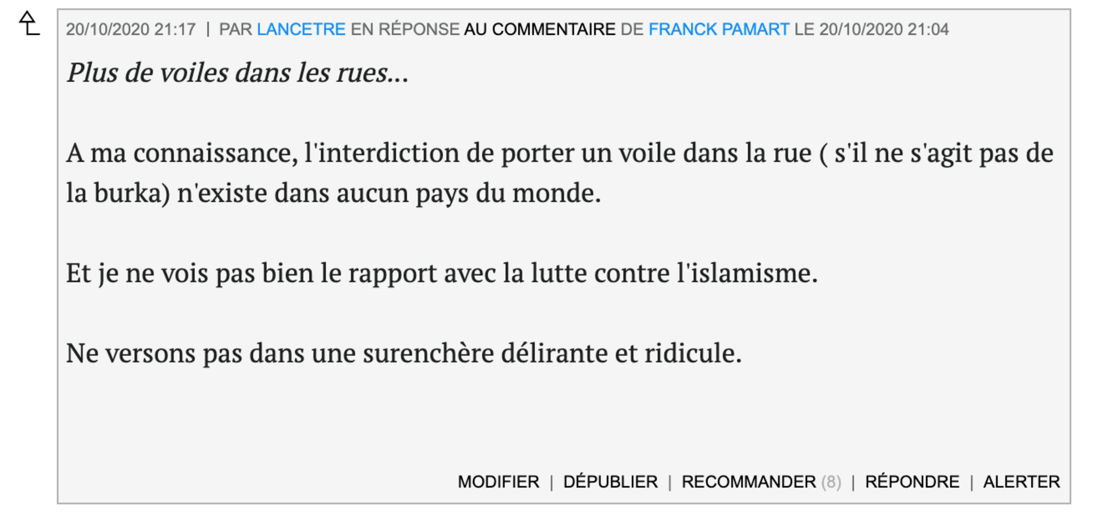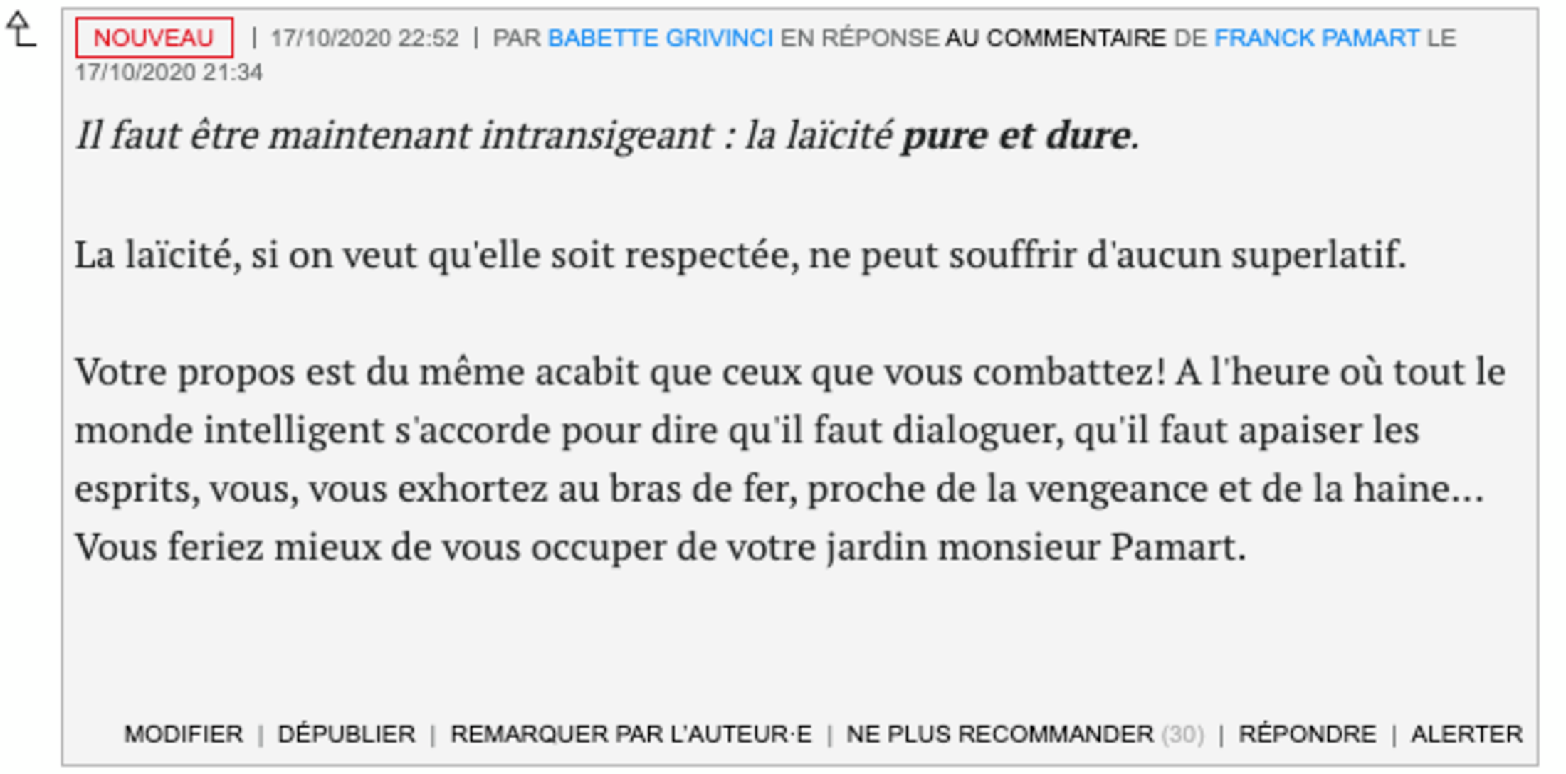 Pour finir et malgré la seconde vague, les attentats, l’islamophobie, ce mois-ci les abonné·e·s ont continué à challenger la modération pour upgrader son efficience, et j’espère qu’avec le Covid, l’islamophobie, l’écriture inclusive, les anglicismes, je vais me faire insulter. La modération a besoin de travail !