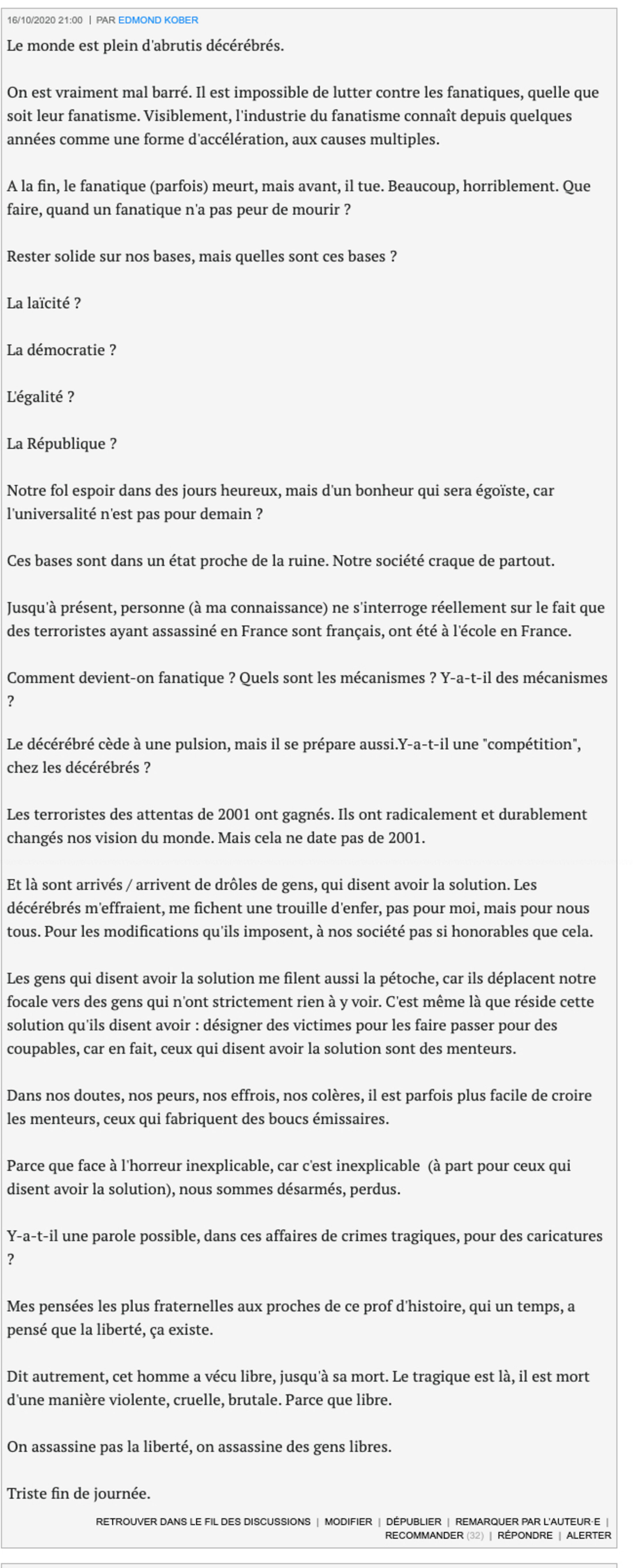 Trop Très rapidement, l’émotion submergeant encore l’air, les débats ont commencé, sur la réponse à apporter, sur la laïcité et malheureusement sur d’autres sujets.