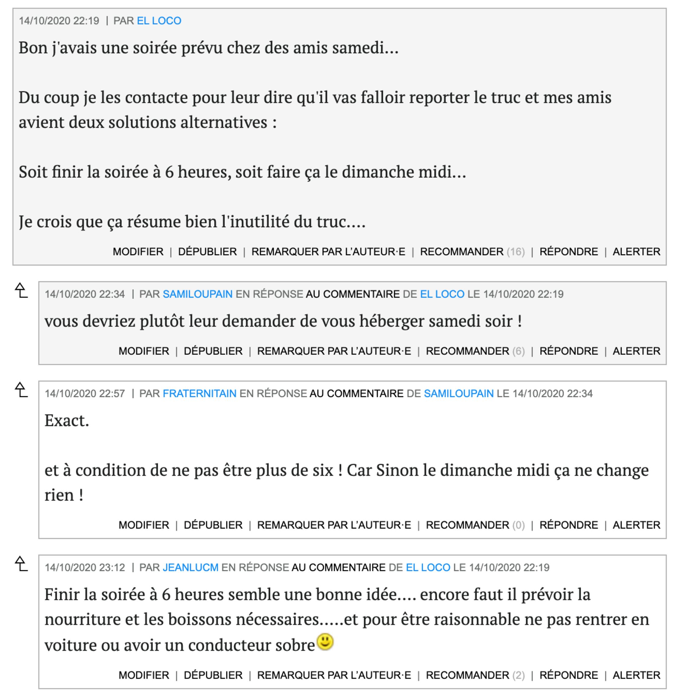 On se donne également dans les commentaires des astuces face au couvre-feu, aux restrictions, à la « règle des six ». Le quotidien est politique, et les soirées prévues chez des amis deviennent des actes subversifs.
