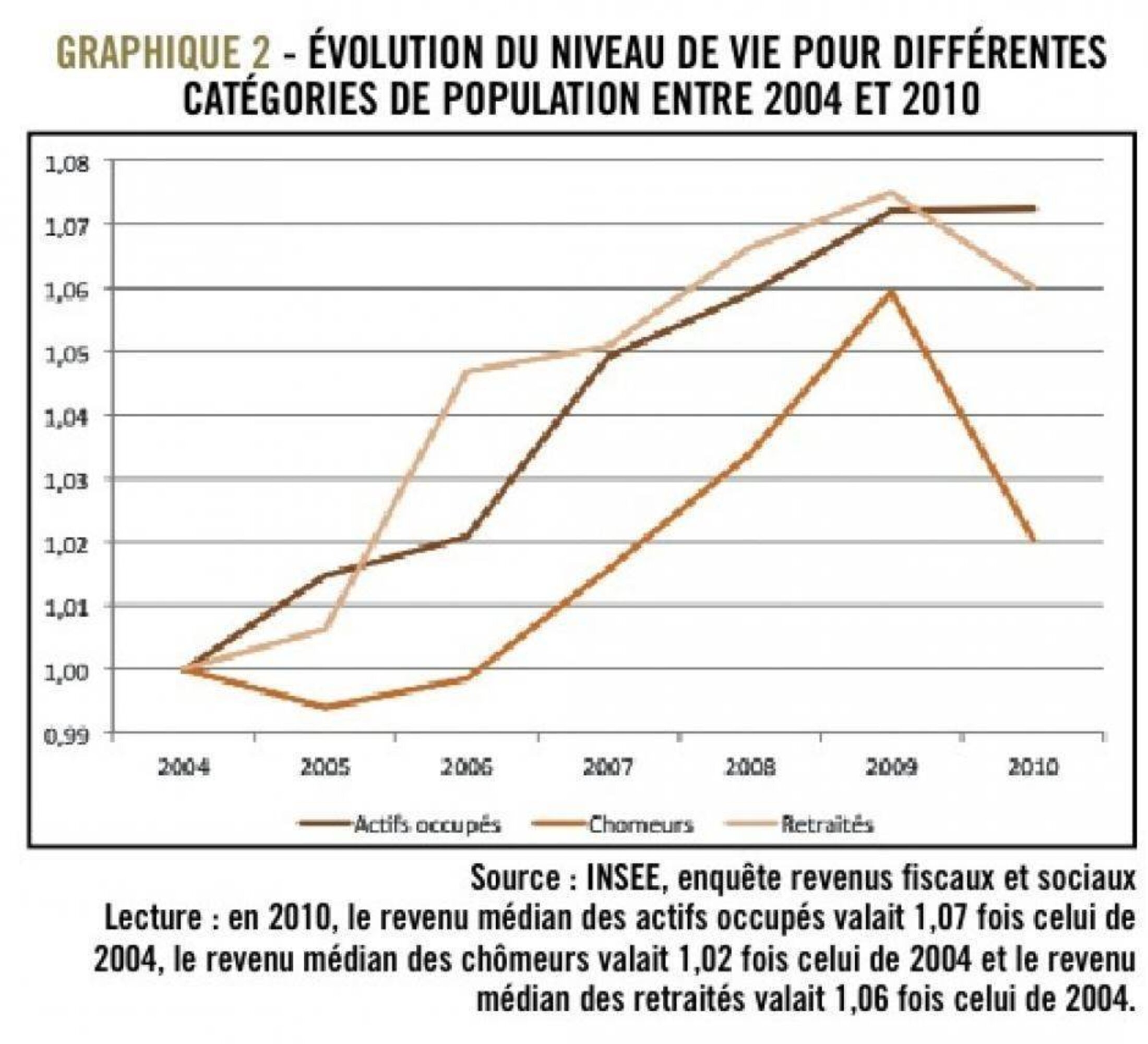 Malgré cet effet égalisateur, le système social français ne protège malheureusement pas aussi bien qu’on pourrait le souhaiter l’ensemble des Français, et notamment les plus précaires (graphique 2). Alors que les actifs en emploi maintiennent leur niveau de vie médian entre 2009 et 2010, celui des retraités diminue de 1,4 %. Depuis 2004, pourtant, le niveau de vie de ces deux catégories évoluait sensiblement de la même façon. Pour les chômeurs, le constat est encore plus inquiétant : leur niveau de vie médian a baissé de 3,7 % entre 2009 et 2010, ramenant celui-ci à un niveau proche de celui de 2007.