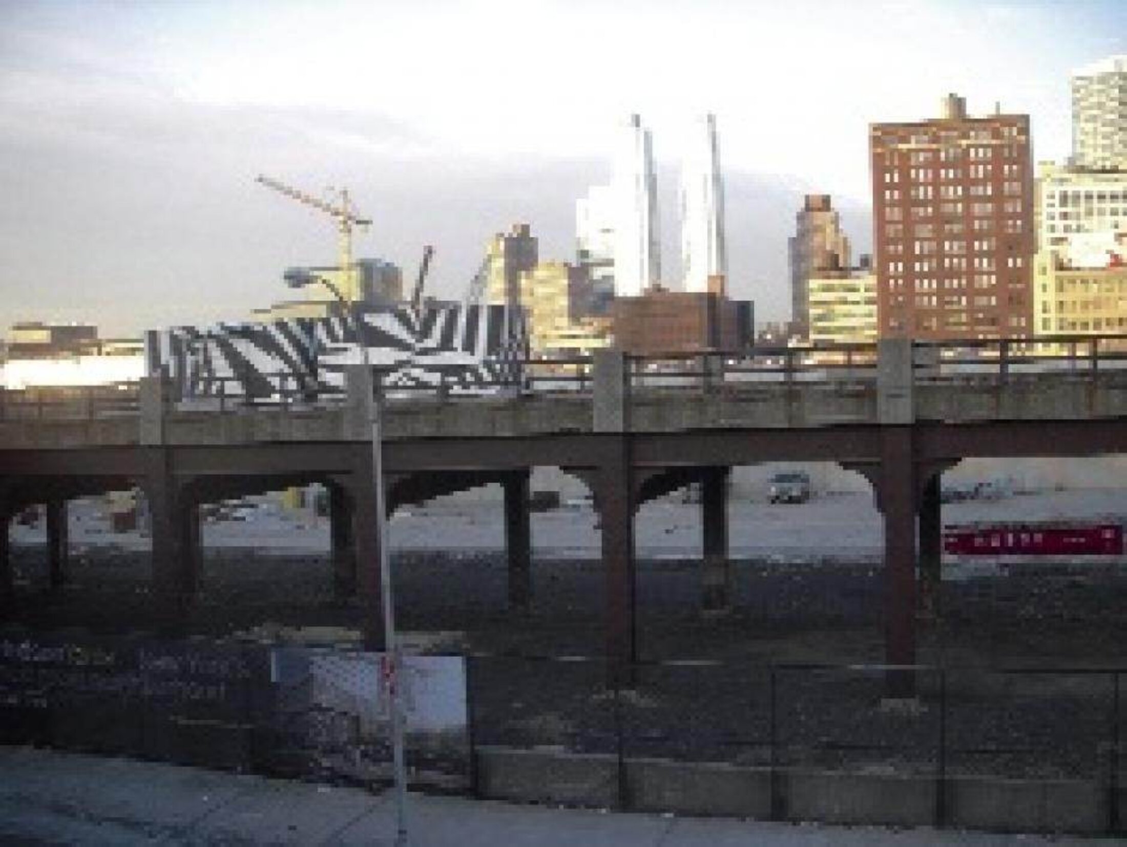 Aménagement de terrains en vue de la construction de gratte-ciels de standing dans l'ancien quartier ouvrier de Hell's Kitchen (Manhattan, New-York)