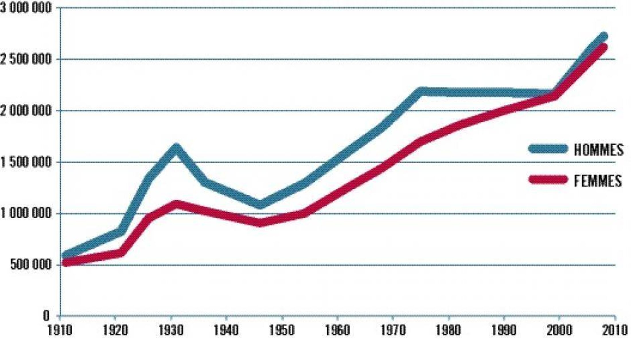 Nombre d’hommes et de femmes immigrés en France entre 1911 et 2008