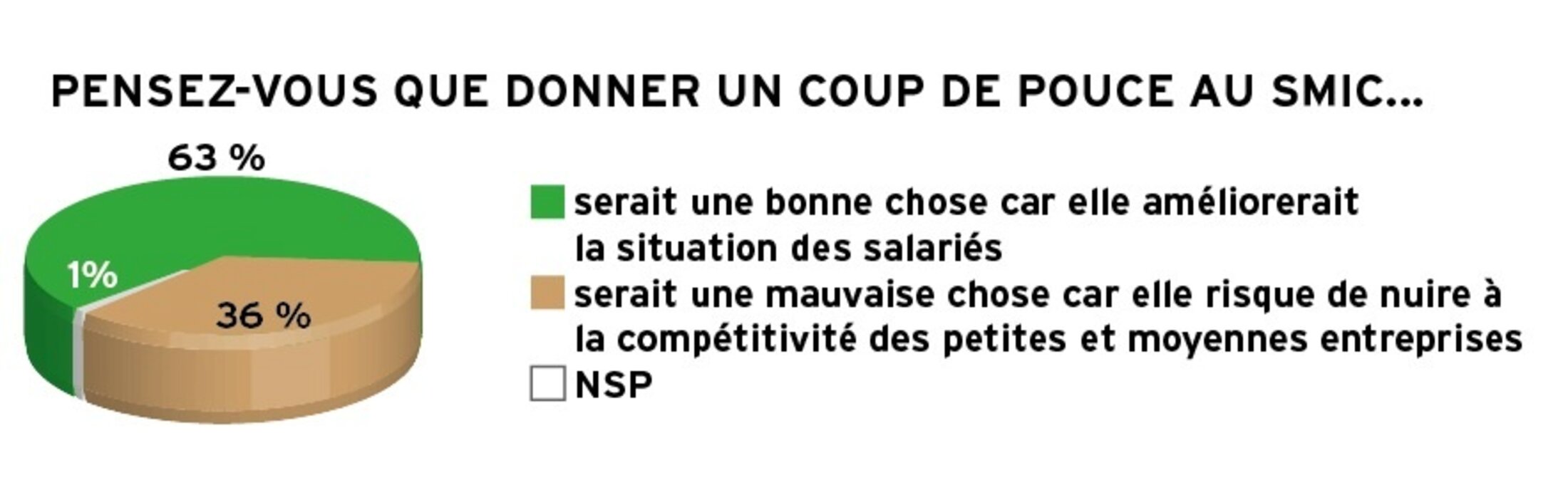 Un sondage OpinionWay pour Tilder-LCI, en juin, montrait que 63% des sondés trouvait que c'était « une bonne chose car elle améliorerait la situation des salariés ». Cet enjeu est aussi très emblématique de bataille d'idées aujourd'hui. C'est un des domaines où la bataille d'idées est la plus acharnée. « La violence de la crise » imposerait « une baisse des salaires » rabâche la vulgate libérale, la compétitivité serait à ce prix et donc l'austérité serait fatale... Dans le même temps, cette question du SMIC est aussi « un marqueur idéologique » note par exemple Frédéric Latrobe de Tilder, qui commandait ce sondage, avec une très forte symbolique de gauche. Le choix des sondés, en effet, est très différent selon leur positionnement politique. 89 % des électeurs du Front de gauche trouvent qu'il s'agit d'une bonne idée alors 73% des électeurs de Sarkozy estiment que c'est une mauvaise chose !