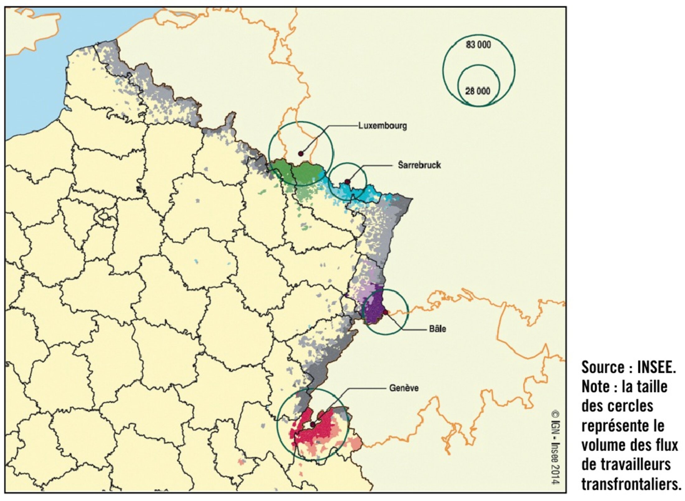 À l’exception du cas particulier de Monaco, enclavé dans le territoire français, l’essentiel des mobilités transfrontalières concerne donc la frontière nord-est du pays (carte), avec notamment quatre pôles importants : Luxembourg (68 000 personnes), Sarrebruck (23 390 personnes), et les deux agglomérations transfrontalières de Suisse, à savoir Bâle (33 580 personnes) et principalement Genève (agglomération la plus concernée avec 87 570 travailleurs transfrontaliers).