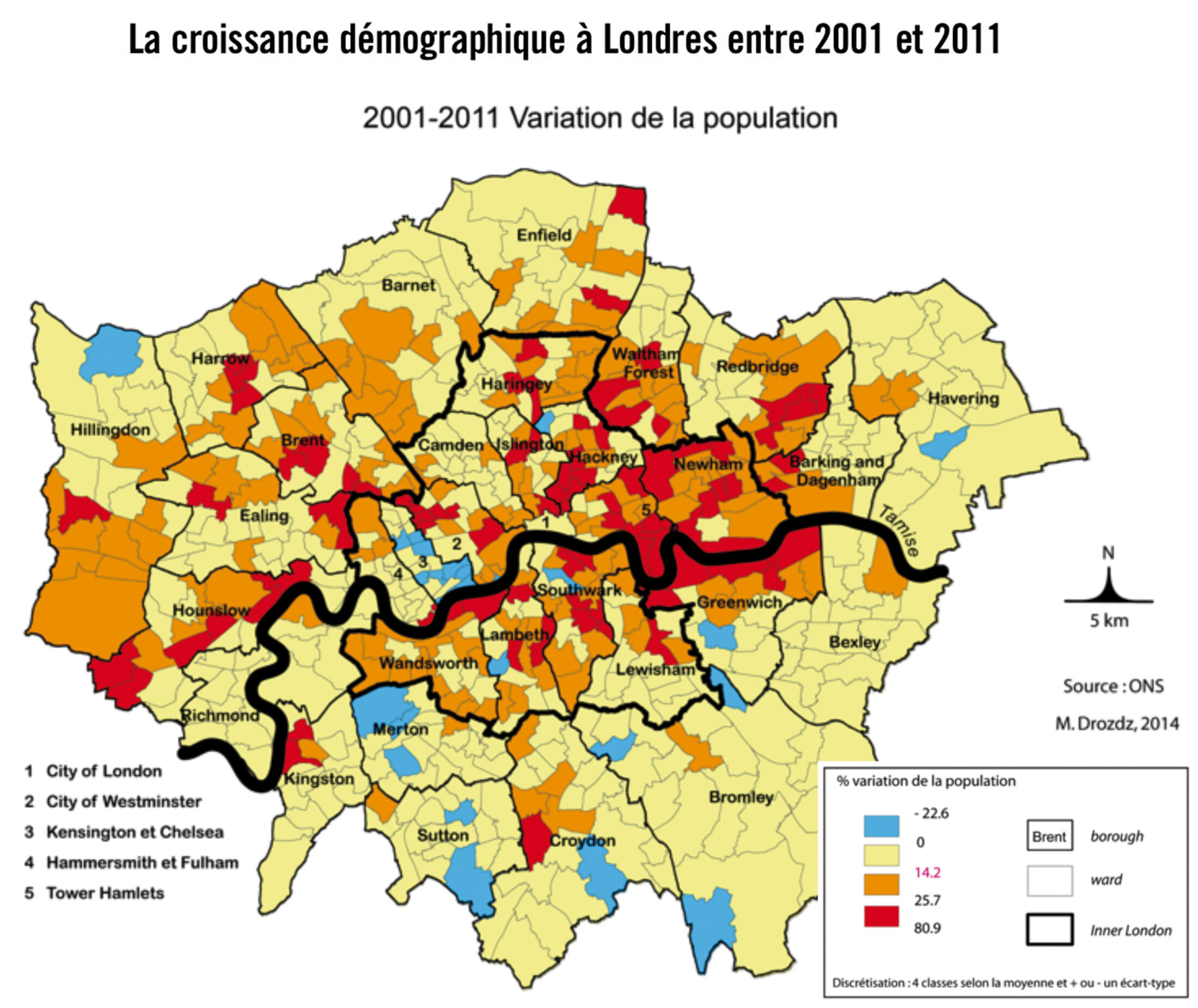Les zones dans lesquelles la croissance est la plus forte – au-delà de 25 % – se situent à l’est et au sud de la Tamise. De nouveaux projets immobiliers ont ainsi transformé les paysages historiques de l’East End populaire et industriel. Ils se sont construits le long de l’axe nord sud de l’Overground, la ligne de métro aérien ouverte en 2010. Le long de la Tamise, les zones de rénovation urbaine et de reconversion économique connaissent quant à elles une croissance démographique supérieure à 50 %, en raison de la reconversion du foncier industriel vers des projets résidentiels. La disparition des activités liées au port depuis une cinquantaine d’années offre ainsi des terrains considérables – mais fortement pollués – dont la reconversion s’effectue progressivement, au gré des cycles de croissance des marchés immobiliers.