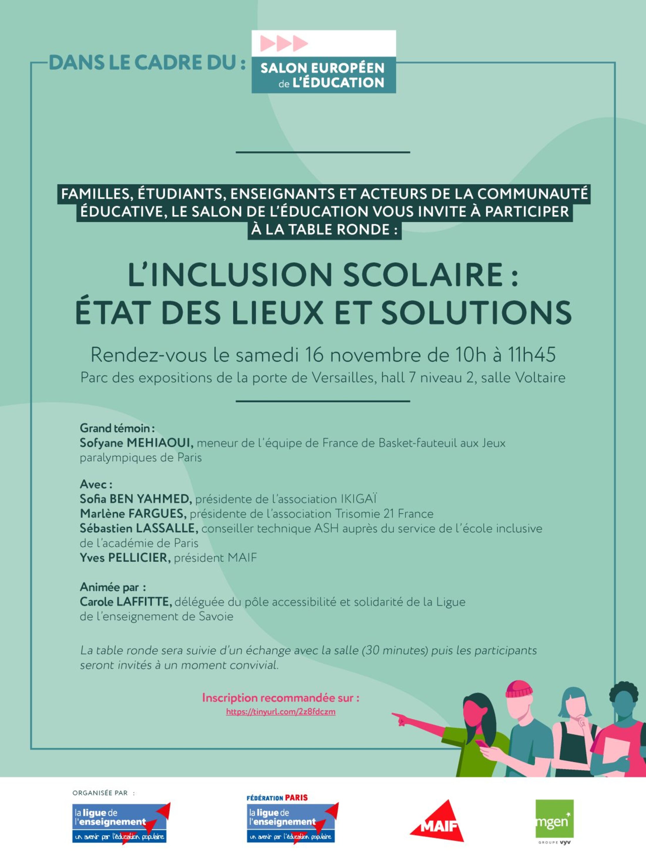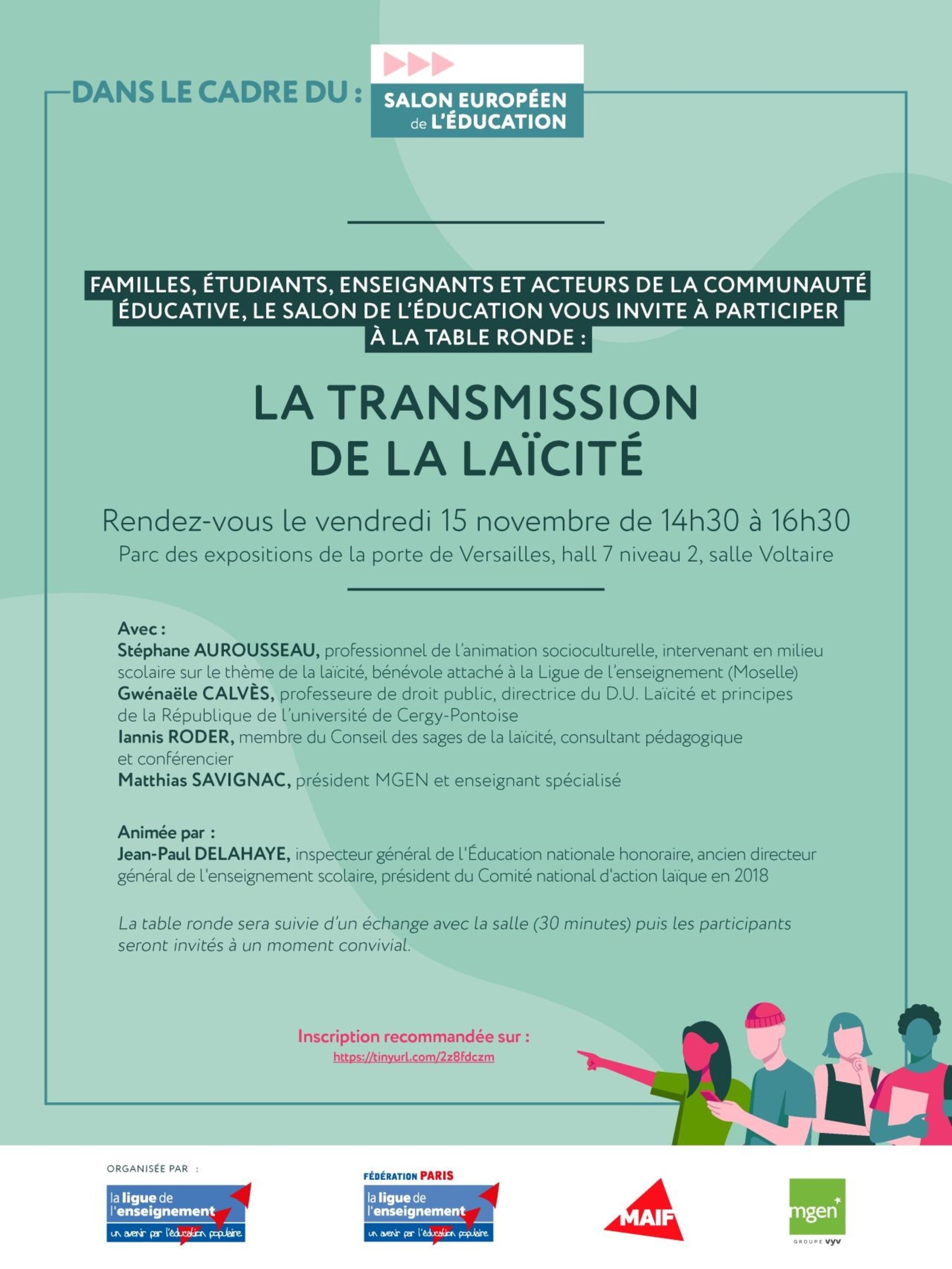 Deux tables rondes se déroulent au Salon de l'Education au Centre Paris Expo Porte de Versailles : "Comment transmettre la laïcité ?" le vendredi 15 novembre à partir de 14h30 et "L'inclusion scolaire: état des lieux et solutions" le samedi 16 novembre à partir de 10 h. L'entrée au Salon est libre.