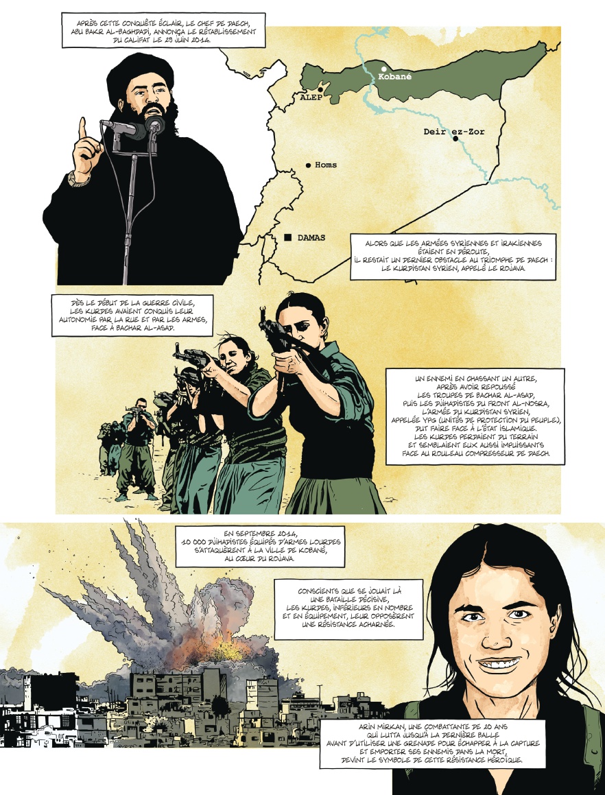 Car c’est la principale qualité de cette BD que de nous rappeler que loin du formatage médiatique autour d’un monde monolithique sur une vision très américaine existe une multitude expériences entre-deux qui donnent des leçons à notre modèle de République laïque universaliste. Le problème Kurde est ancien et pour une fois pas complètement la faute du partage des Empires après la première guerre mondiale. Si certains territoires disputés par des nationalismes peuvent prêter à discussion, l’intégrité ethnique, religieuse, politique et même géographique du Kurdistan justifie entièrement l’existence d’une Nation, que le délitement irakien et syrien auraient pu officialiser. Malheureusement le soutien russe à la guerre civile syrienne mais surtout indéfectible soutien américain au terrible pouvoir turc qui n’a jamais accepté l’existence d’un autre peuple sur une partie de son territoire obère l’existence de cet Etat. Et pas seulement pour des raisons religieuses.