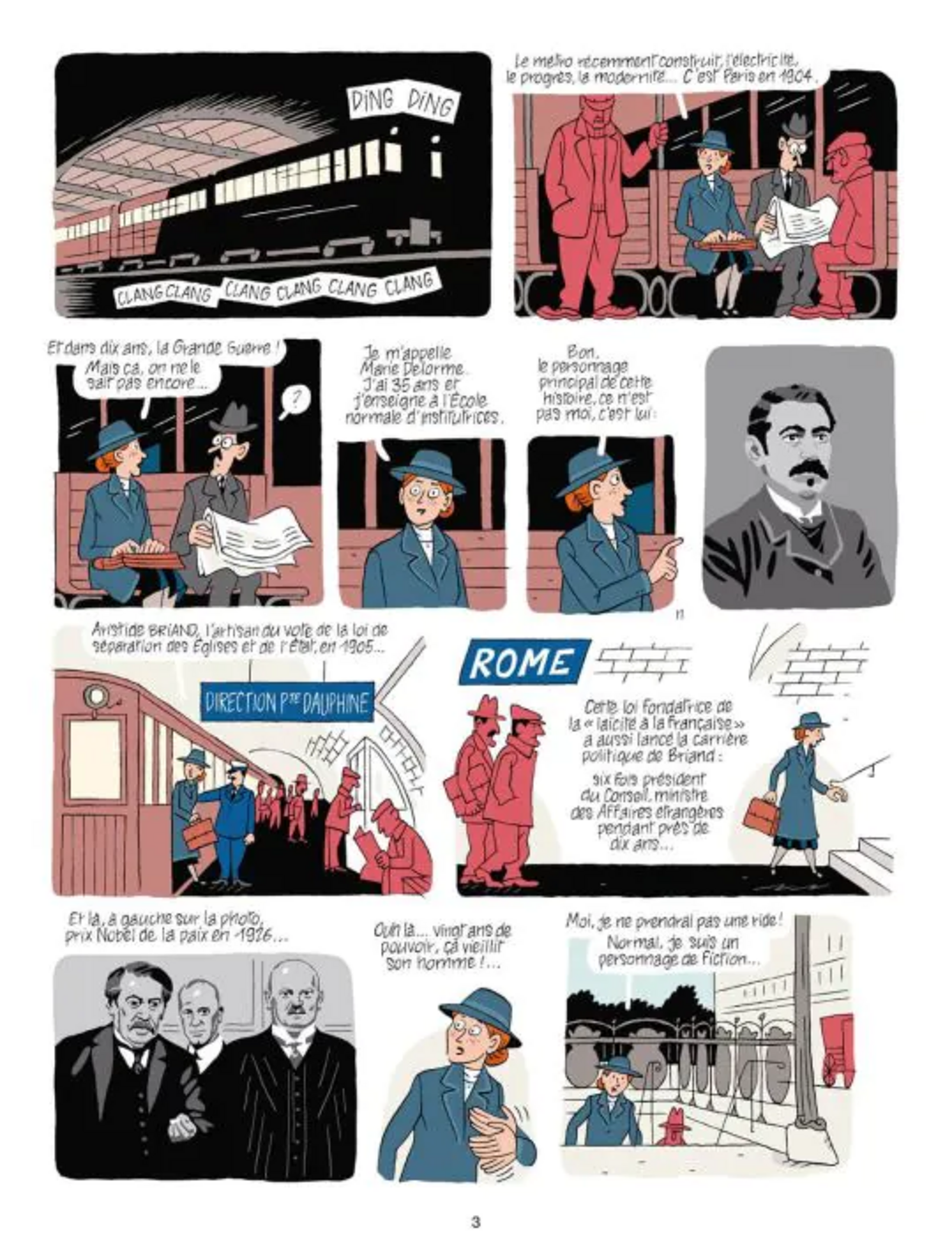 L’expérience du dessinateur Alexandre Franc dans La Revue dessinée est manifeste, dans un parti pris pédagogique tout à fait salutaire, tant la complexité technique et philosophique des débats évoqués avait tout pour perdre le lecteur. Les auteurs ont ainsi eu l’excellente idée de nous accompagner avec un personnage fictif qui se présente comme tel et brise le quatrième mur. Marie Delorme incarne une modernité féministe, institutrice montée à Paris où elle va partager la vie d’Aristide Briand. Ce procédé malin permet de créer une fiction dispensée de réalisme, qui fluidifie les éléments historiques. Ceux-ci nous seront proposés par des cartons narratifs, par la mise en scène de débats dans l’hémicycle, de discussions au sein du camp radical-laïque de Ferdinand Buisson ou à l’opposé chez les conservateurs et jusqu’aux prêtres qui représentent encore une partie de la France réactionnaire et revancharde de l’Ancien Régime (on rappellera que le second Empire n’a chu que trente cinq ans auparavant).