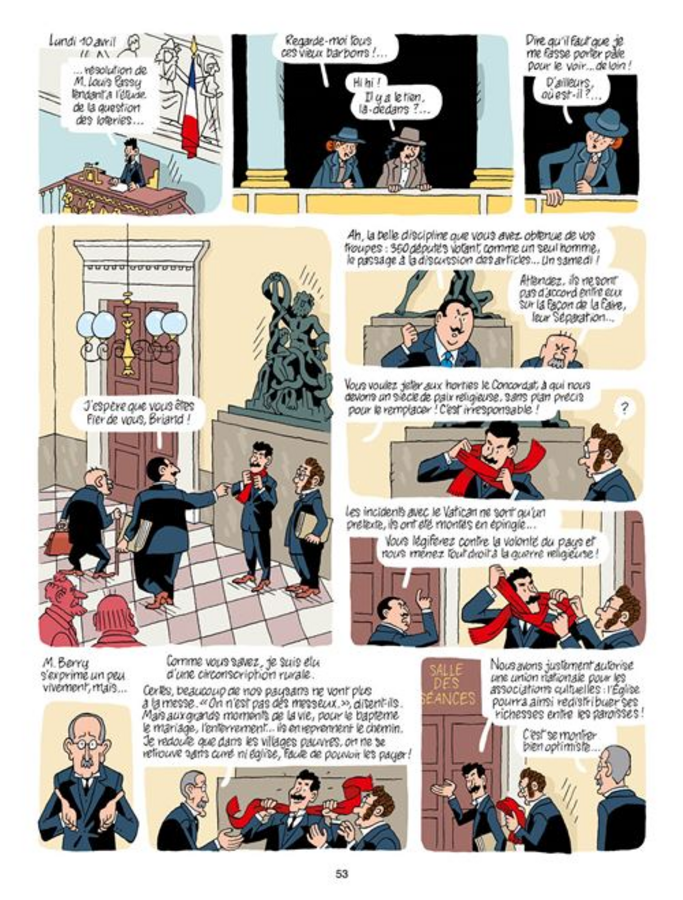 Passionnant de bout en bout, léger, aussi éclairant sur la réalité sociale de l’époque que sur un écart de qualité législative terrifiant avec l’hémicycle actuel, cet album est une magnifique action pédagogique tout à fait salutaire à l’heure où l’on parle. Il n’a jamais été aussi nécessaire de relire la loi de 1905 pour démasquer ceux qui instrumentalisent une pseudo-laïcité pour attaquer une religion particulière (l’Islam). Lorsque le Droit est bien dit et bien écrit il est toujours terriblement compliqué aux obscurantistes de le défaire. En cela la loi de 1905 est un cas d’Ecole de travail législatif historique.