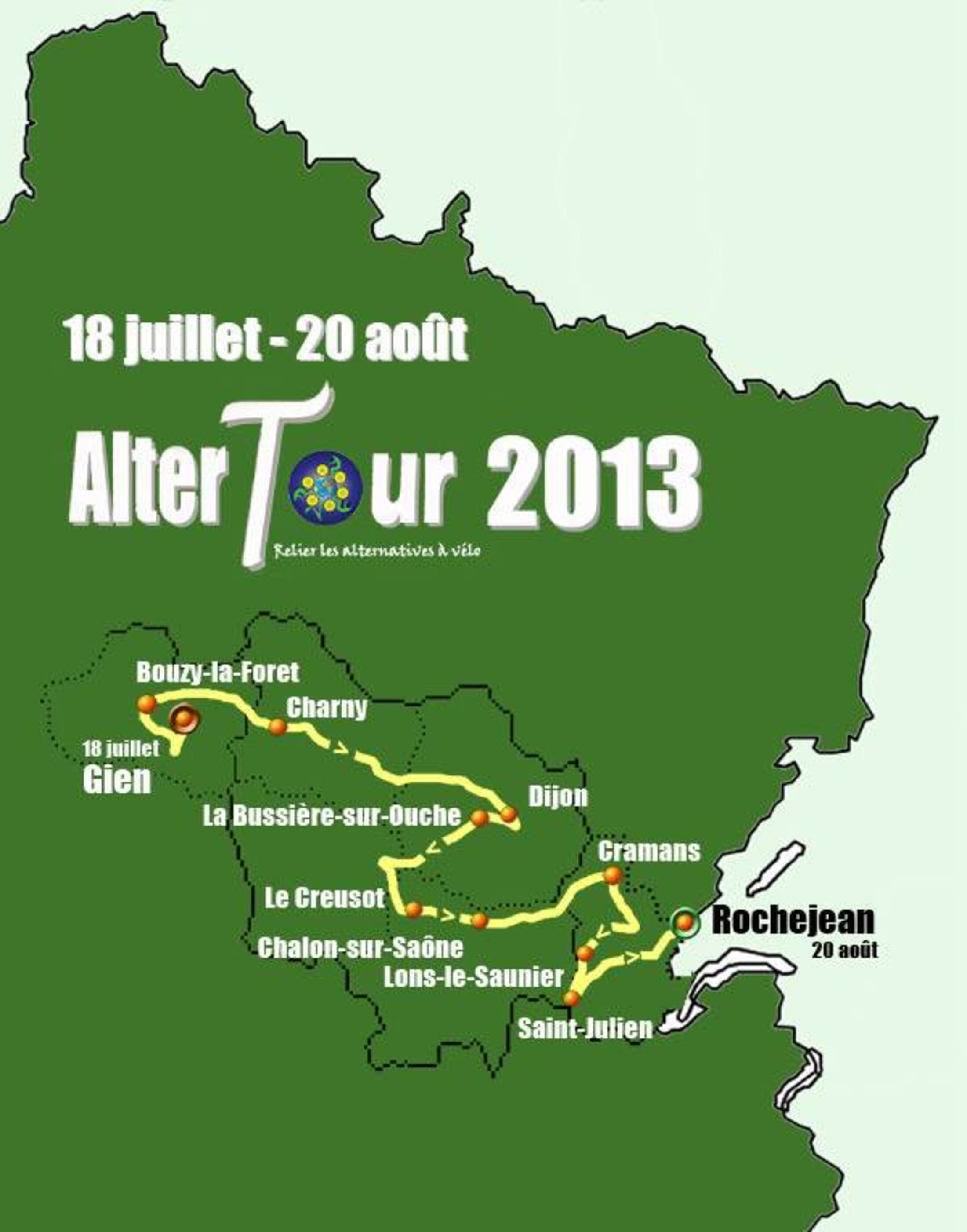 L'AlterTour 2013 démarrera de Gien dans le Loiret pour se terminer à Rochejean dans le Doubs, il passera par le la Nièvre 58, l'Yonne 89, la Côte d’Or 21, la Saône et Loire 71 et le Jura 39.