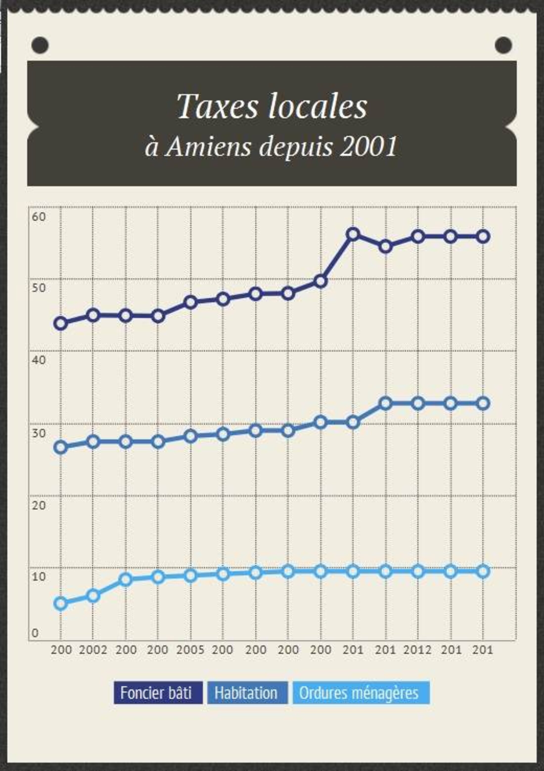 Il est donc nécessaire d'y voir plus clair. C'est ce que nous allons tenter de faire dans cet article: mettre en lumière l'évolution des impôts locaux à Amiens depuis 2001. Notons que les chiffres qui seront donnés ci-après proviennent de sources ministérielles et disponibles sur ce portail. En outre, nous avons croisé ces données avec celles fournies par les services d'Amiens métropole.