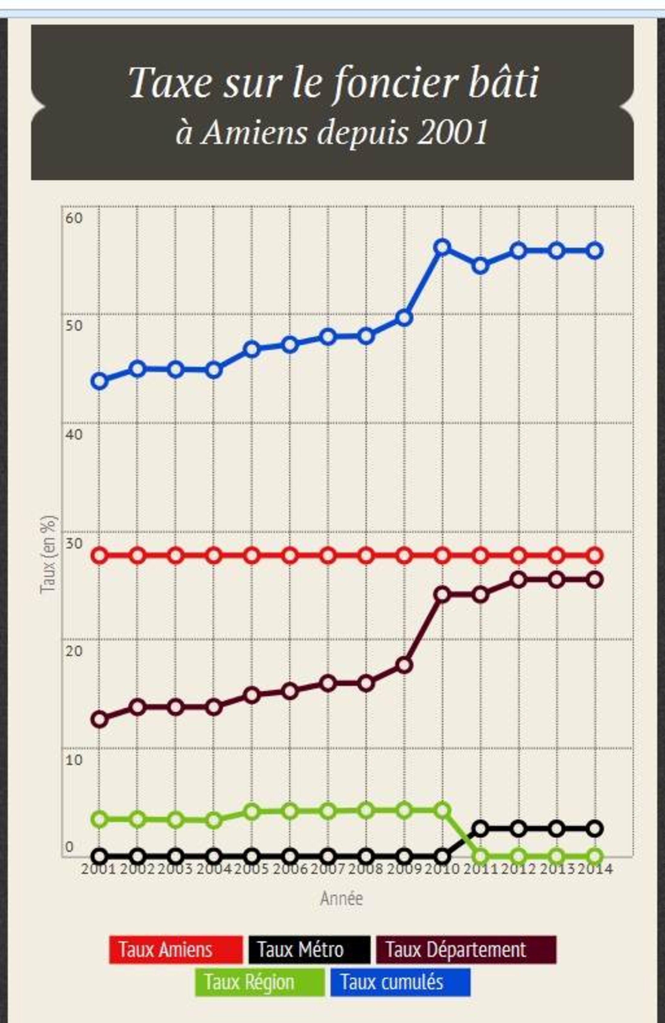 Clairement, dans le graphique de droite, nous retrouvons l'évolution du taux de TFB décidé par la Ville d'Amiens (en rouge) entre 2001 et 2014, puis le taux décidé par Amiens métropole (en noir), celui voulu par le conseil général de la Somme (en Bordeaux) et celui voté par le conseil régional de Picardie (en vert). L'addition de ces taux donne la courbe bleue, la même que nous avons déjà vue sur le premier graphique, qui est le taux final à partir duquel l'impôt du contribuable est calculé chaque année.