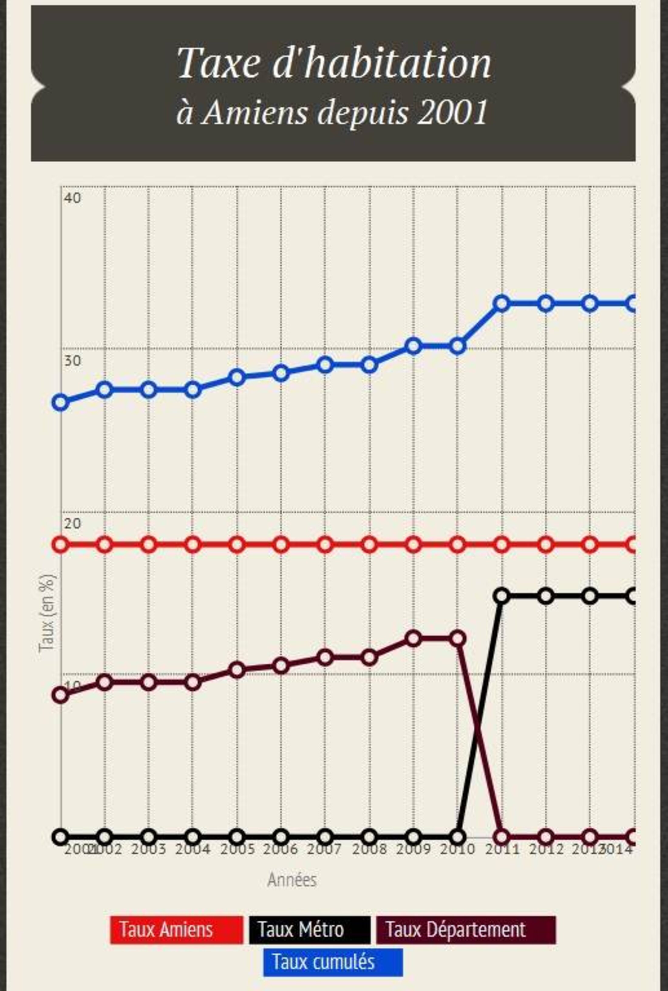 Entre 2001 et 2010 on constate que l'augmentation progressive de la taxe d'habitation est uniquement due au conseil général de la Somme. Mais en 2011, gros changement: la TH n'est plus perçue par le Département, son taux tombe à 0%, mais il est récupéré par la Métropole, comme l'indique la loi. Pourtant, ce nouveau taux métropolitain atteint directement les 14,8% alors que le taux du Département n'était que de 12,2% l'année précédente.