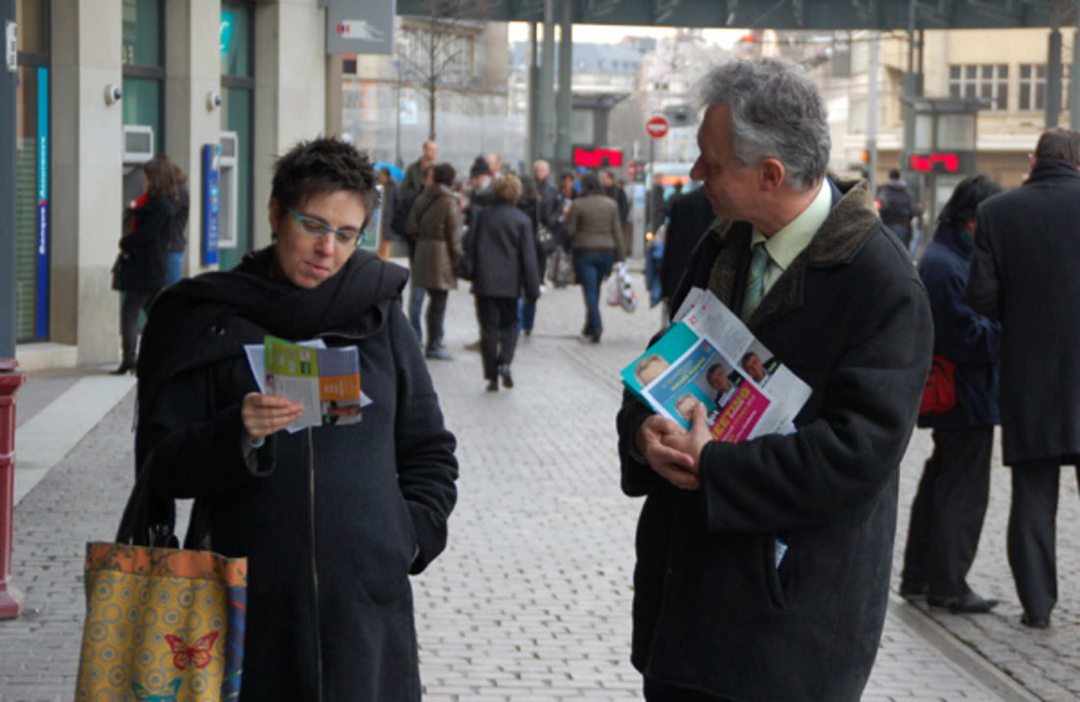 Réunis devant la Fnac mardi en fin d’après-midi, une dizaine de militants et de candidats PS-EE distribuaient leur nouvelle profession de foi et une invitation au meeting du lendemain soir. Zoubida Naili, 24ème sur la liste, a le sens du contact. Elle arrête les passants, leur explique l’intérêt des élections. « Mais oui, j’ai voté dimanche et je voterai au deuxième tour », lui affirme un grand monsieur qui passe son chemin. Elle trotte derrière lui, « Super ! ». Il descend les marches qui mènent aux toilettes publiques souterraines de la place Kléber, elle le rattrape. « Il faut aussi convaincre votre entourage, vos voisins. Jusqu’à dimanche, il faut en parler à tout le monde ! »