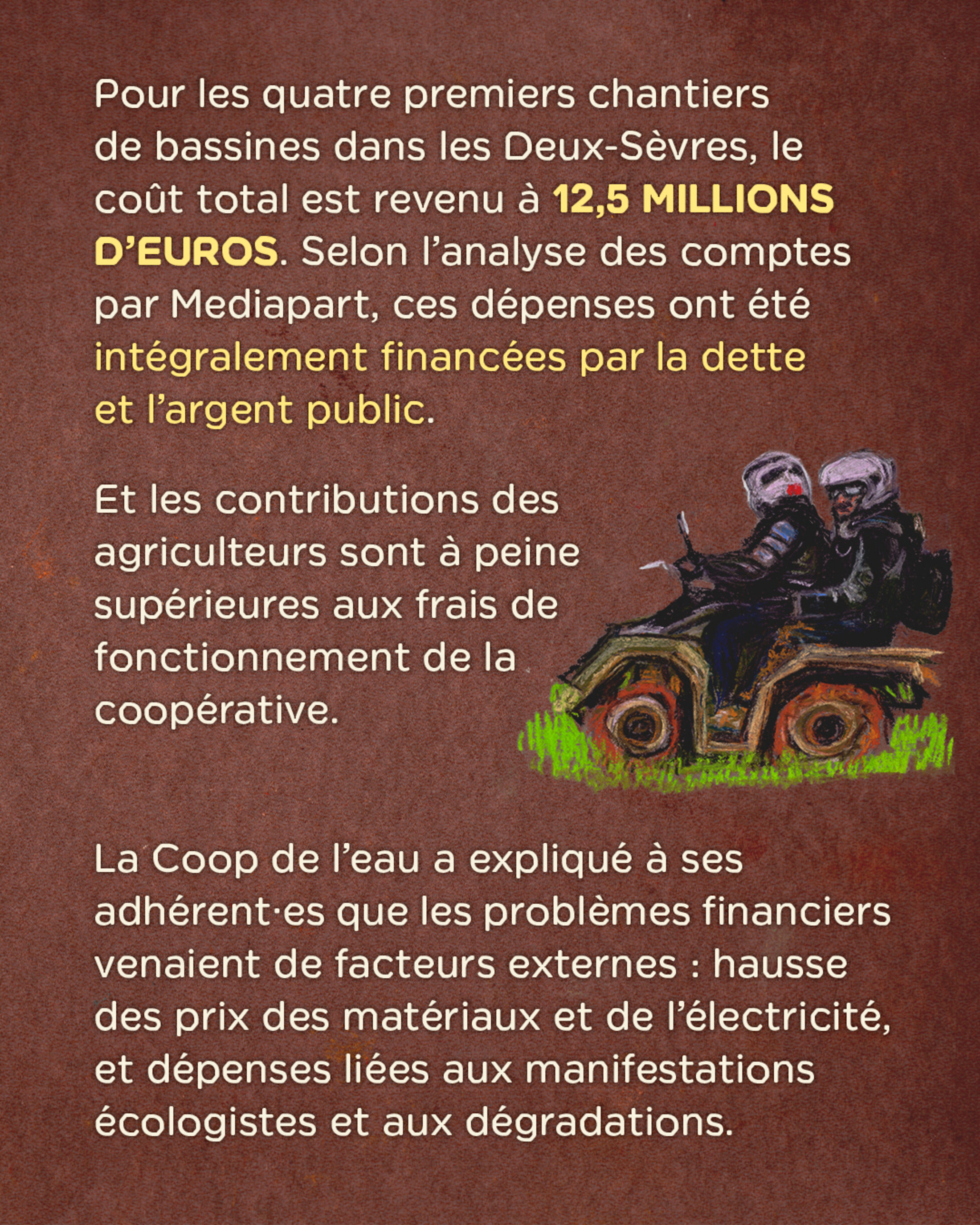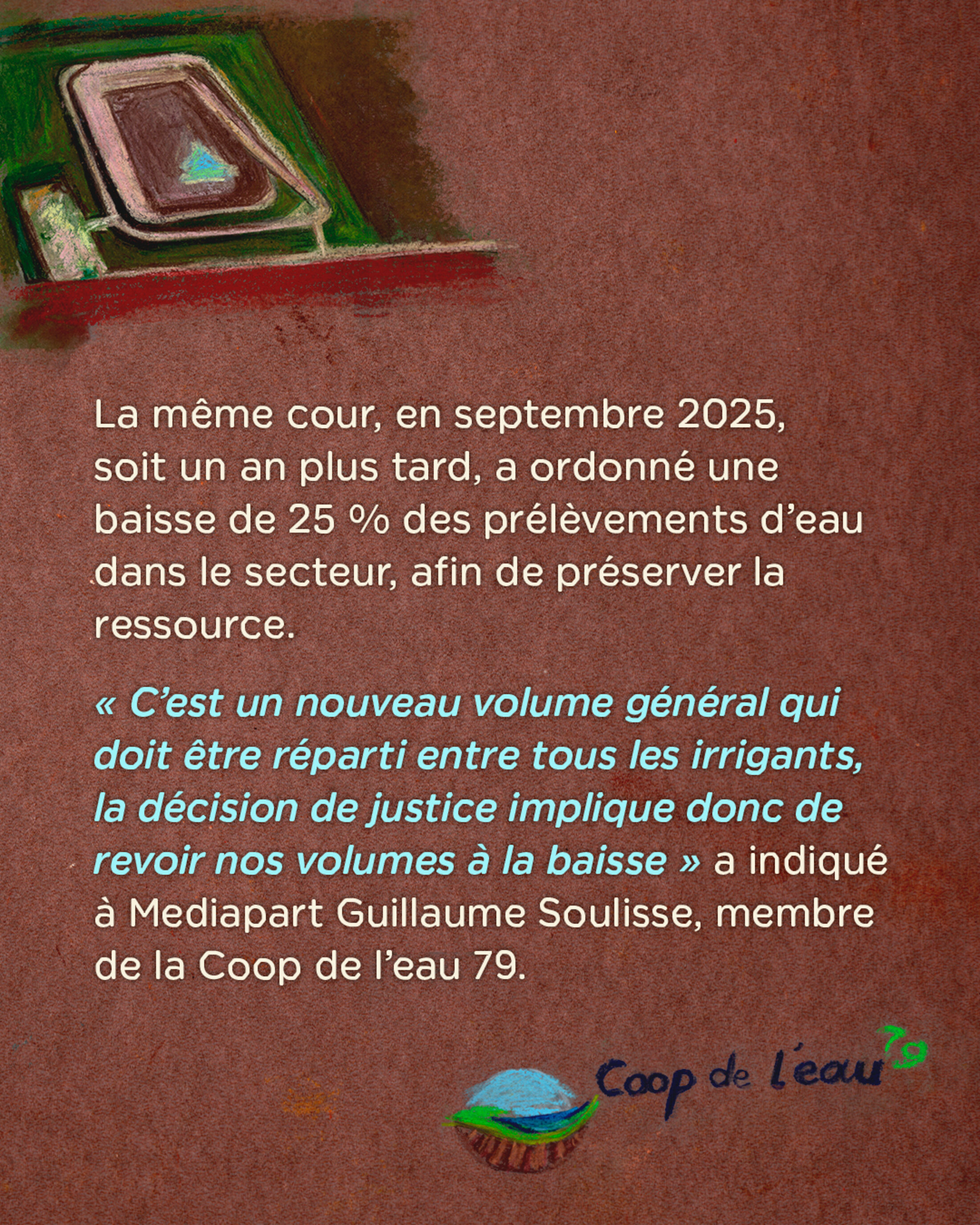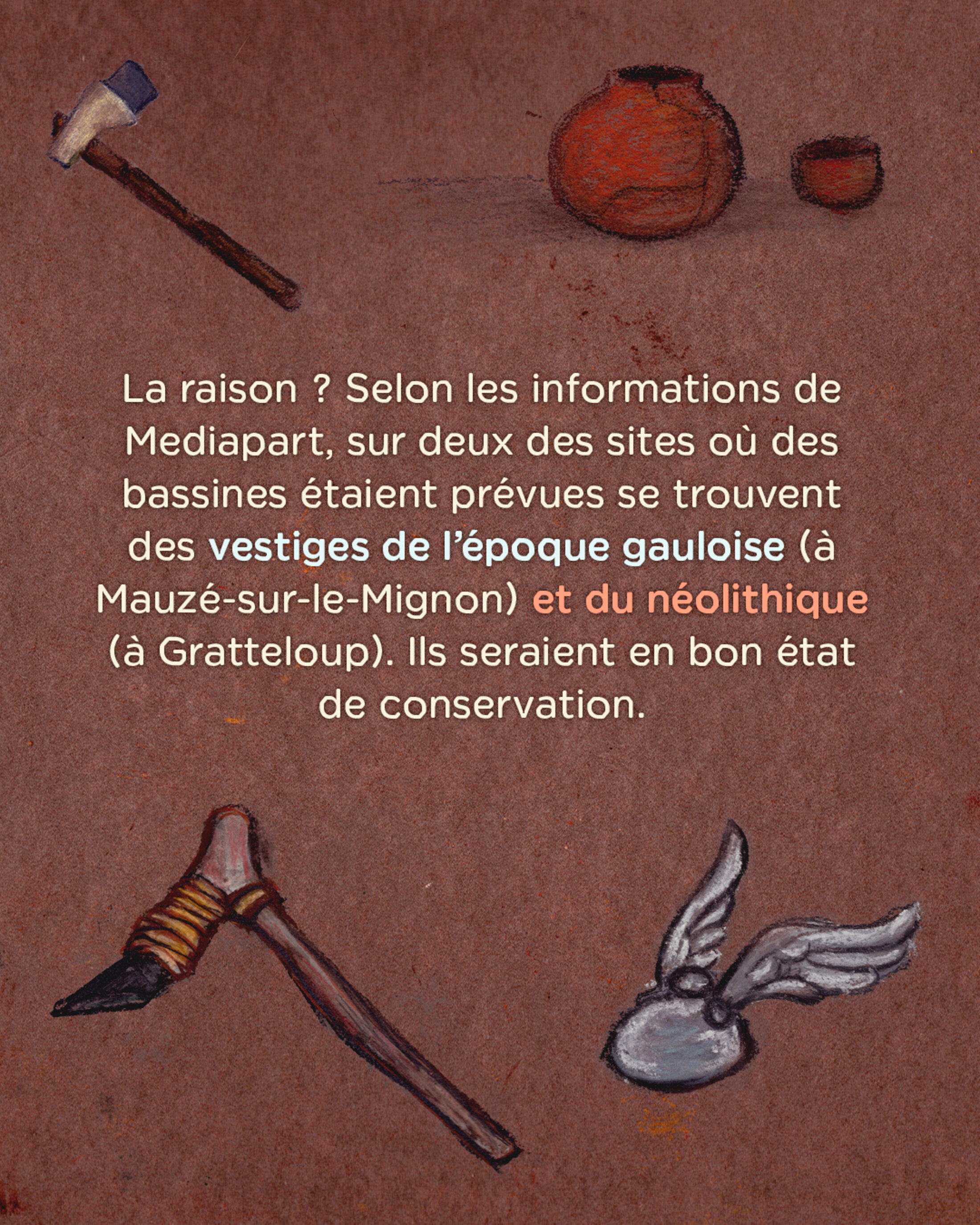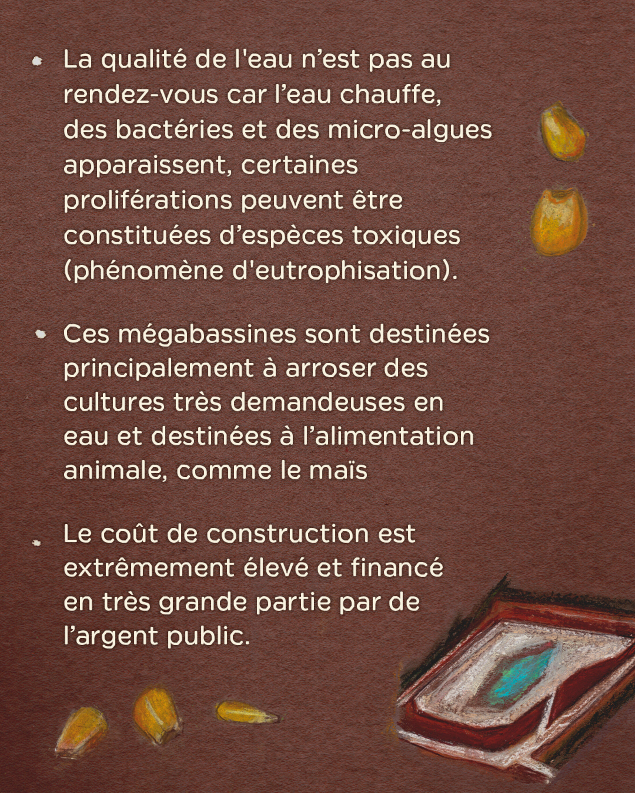 Inspirée par les articles d'Amélie Poinssot et de Yann Philippin, une vulgarisation illustrée au pastel, sur le danger des mégabassines.