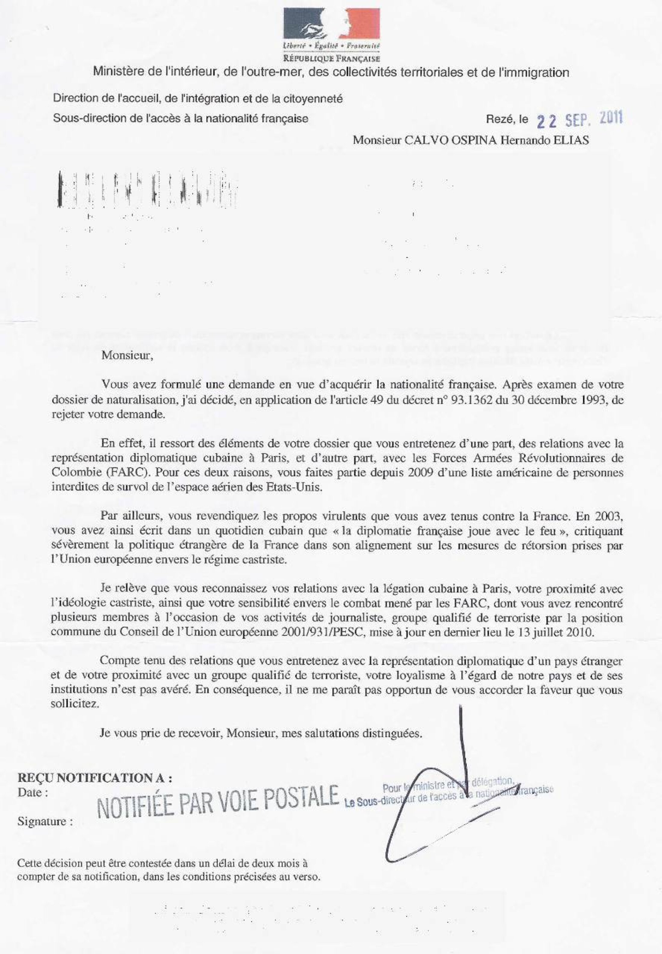 Dans la lettre officielle qu'il a reçue du Sous-directeur de l'accès à la nationalité française au Ministère de l'intérieur, et reproduite ici, trois choses lui sont reprochées: ses relations supposées avec les Farc, ses relations avec la diplomatie cubaine à Paris, et des lignes qu'il aurait écrites contre la diplomatie française.