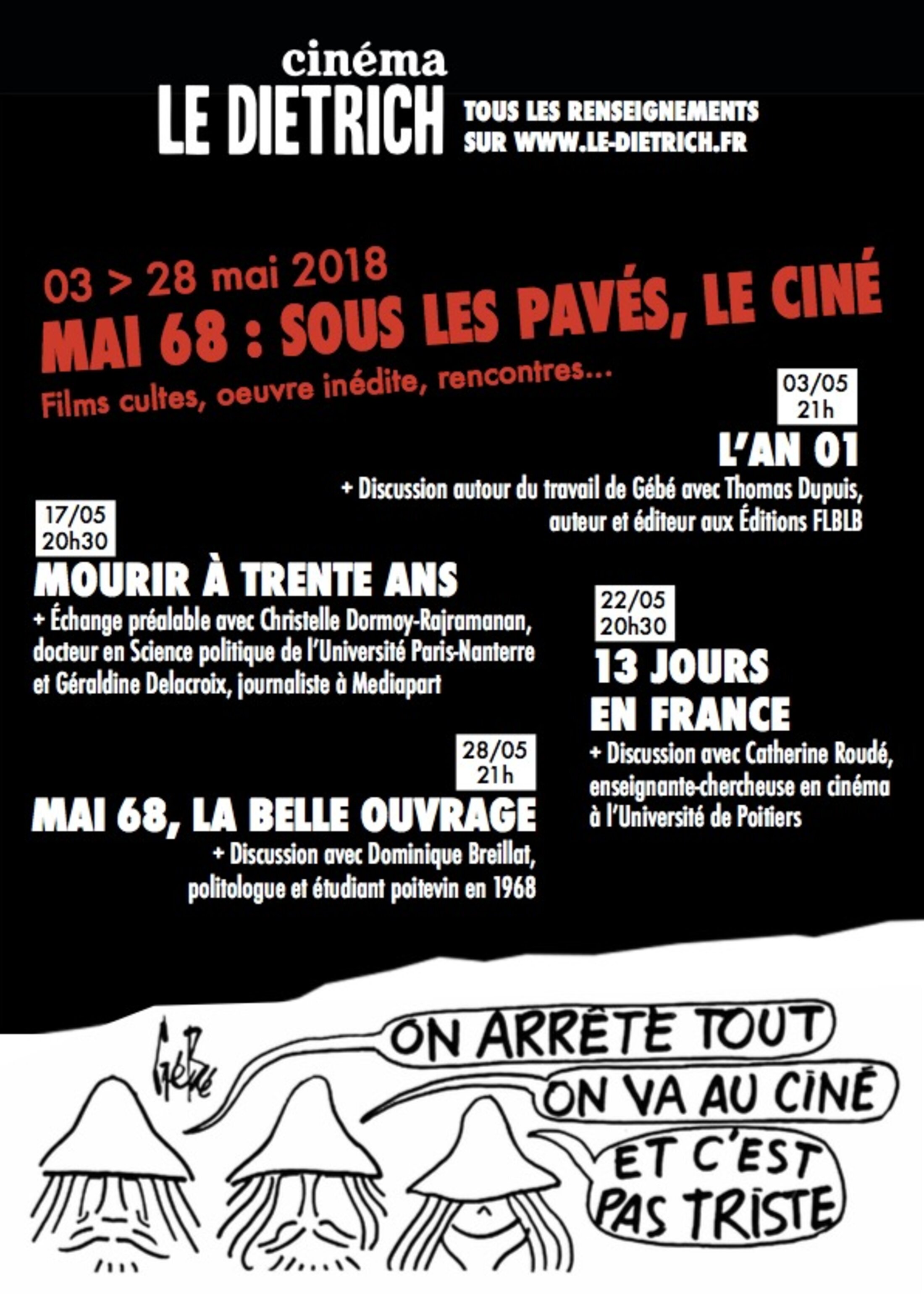 18h : librairie La belle aventure - 12 rue des Grandes Ecoles - Poitiers20h30 : Cinéma Le Dietrich - 34 boulevard Chasseigne - Poitiers