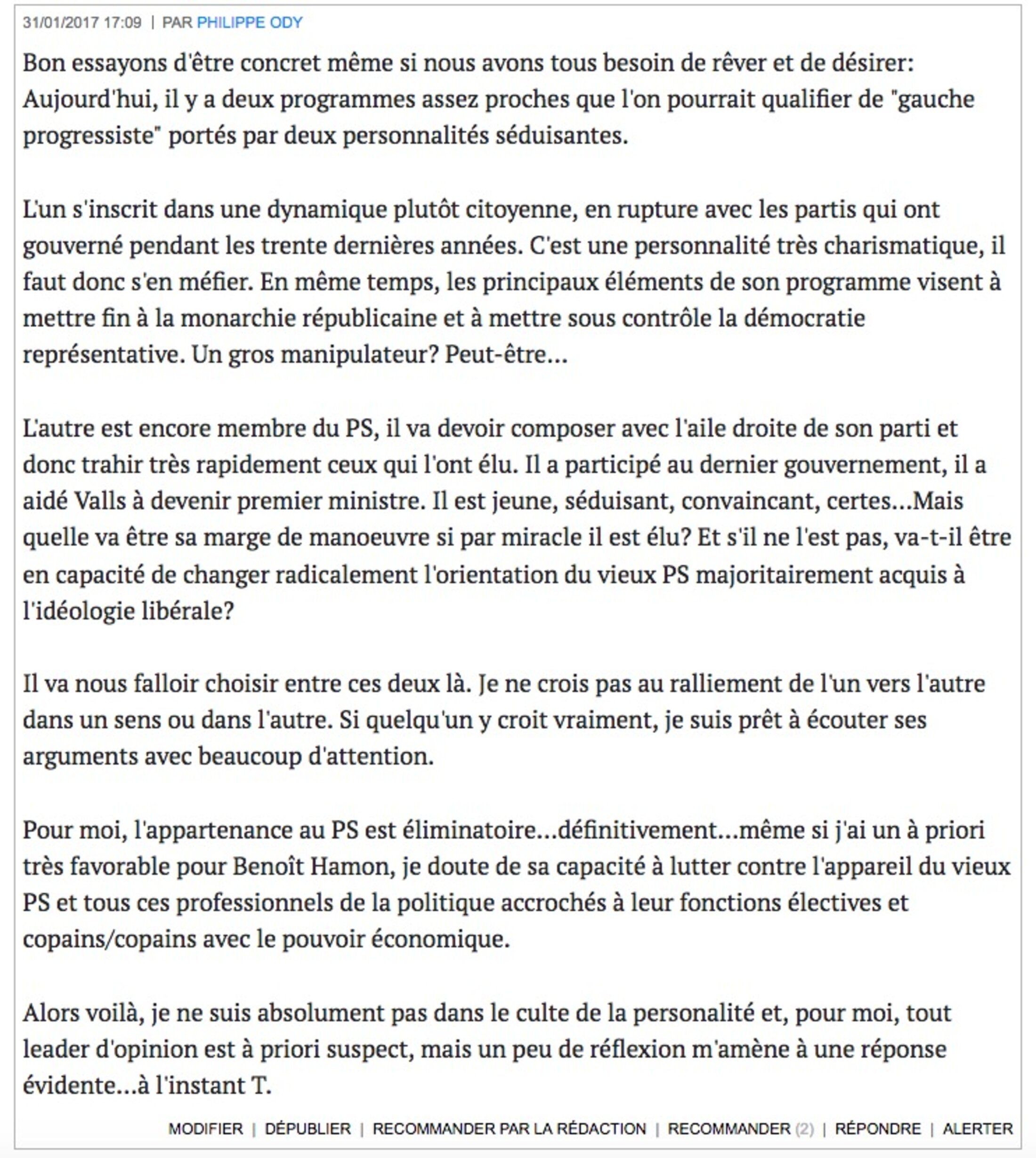Déçu par le quinquennat Hollande, Jean-Marc Adolphe nous invite à lire son «essai improbable de science politique» comme il l’affiche et dans lequel il se dit contraint de faire son coming out. «Bien qu’ayant dit, et écrit, que je ne voterais plus jamais socialiste (entre autre ulcères provoqués par le règne de François Hollande, l’attitude de certains élus socialistes et du gouvernement de Manuel Valls a l’égard des populations Roms a été la goutte d’eau qui a fait déborder le vase : on peut relire ici mon billet « France 2013 : régime d’apartheid ? Lettre ouverte à Manuel Valls, ministre de l’intérieur », mis en ligne en février 2013), j’avoue avoir participé aux deux tours de la primaire de gauche, et chaque fois glissé dans l’urne le nom de Benoît Hamon. Je précise, si besoin est, que je suis loin de me désintéresser des candidatures de Jean-Luc Mélenchon et de Yannick Jadot, qui portent l’une et l’autre d’intéressantes propositions…» Ce billet a ouvert un débat fort riche, sur le parti, le culte de la personnalité… Avec des échanges parfois musclés entre pro Mélenchon et les autres qu’ils soient ou non pro Hamon. D’où ce commentaire raisonné et raisonnable de Philippe Ody :