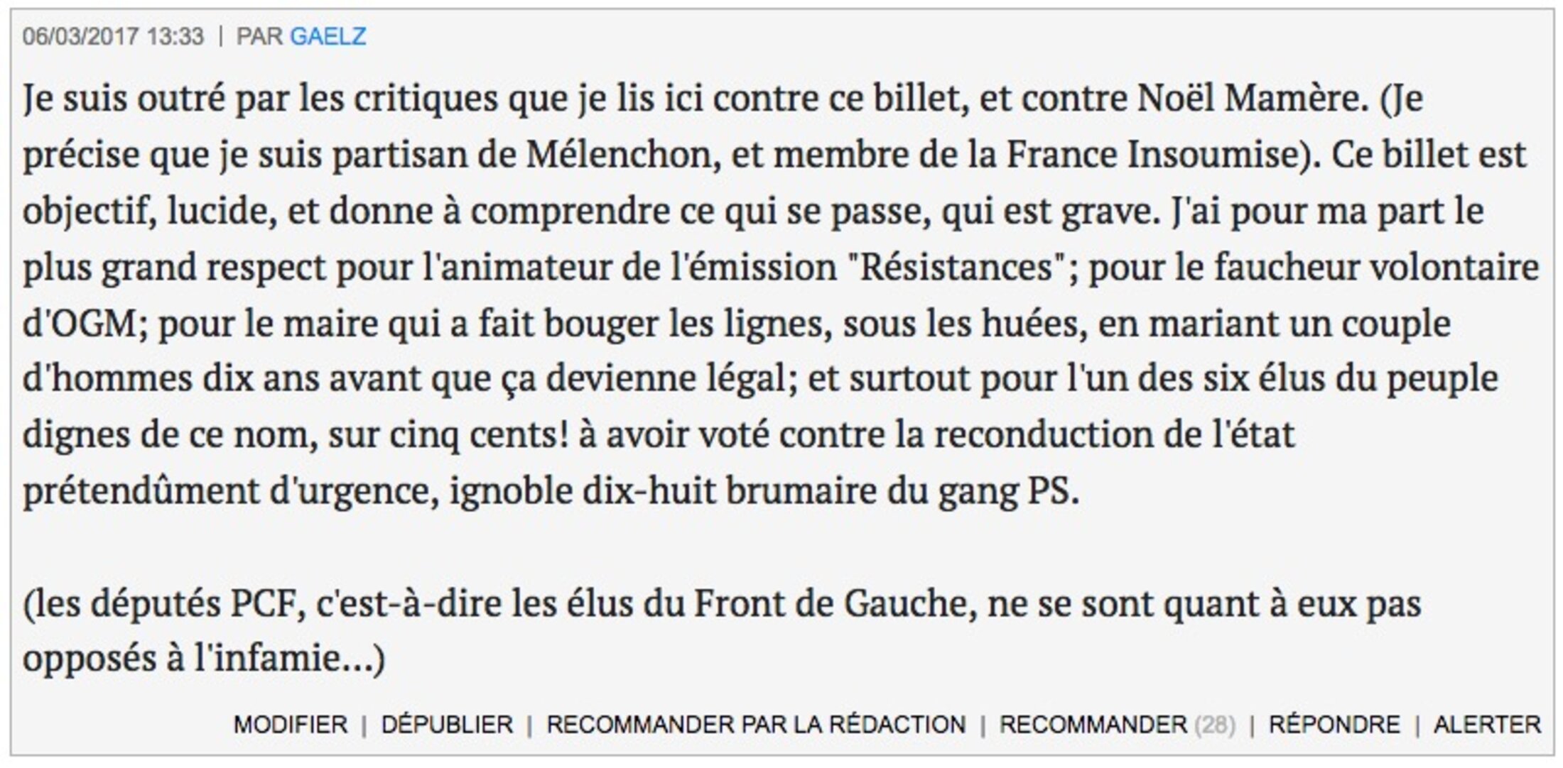 Arnaud Gossement, lui, ose remettre en cause la nomination d’un homme providentiel qui finit très rapidement recouvert de goudron et de plumes. «La campagne présidentielle en cours offre chaque jour son lot de désolations. Toutefois, personne n’ouvre de débat sur le principe même de cette élection : faut-il conserver l’élection du Président de la République au suffrage universel direct ?» Ce billet a engagé nombre de commentaires et beaucoup de débats. Les uns refusant l’idée de grands électeurs, les autres un retour à la monarchie. Les uns défendant l’idée d’une constituante, les autres s’opposant à un retour du 4e République. Pourtant, il n’est pas seul à constater que « cette décomposition politique est en fait celle de la Ve République à bout de souffle.» Le 6 mars, Noel Mamère use de sa liberté de parole encore une fois. Outre la dénonciation de l’hyper présidentialisation, la machinerie des primaires, la profonde fracture entre les « élites » et le « peuple », il décrit une nuit du 4 août 1789 - les députés de l'Assemblée nationale constituante proclament l'abolition des droits féodaux et de divers privilèges - à l’envers. Un monde inversé dans lequel François Fillon et Marine Le Pen nourrissent des complots médiatique et judiciaire. Décrié dans les commentaires par les partisans de Jean-Luc Mélenchon, il trouve comme défenseur Gaelz :
