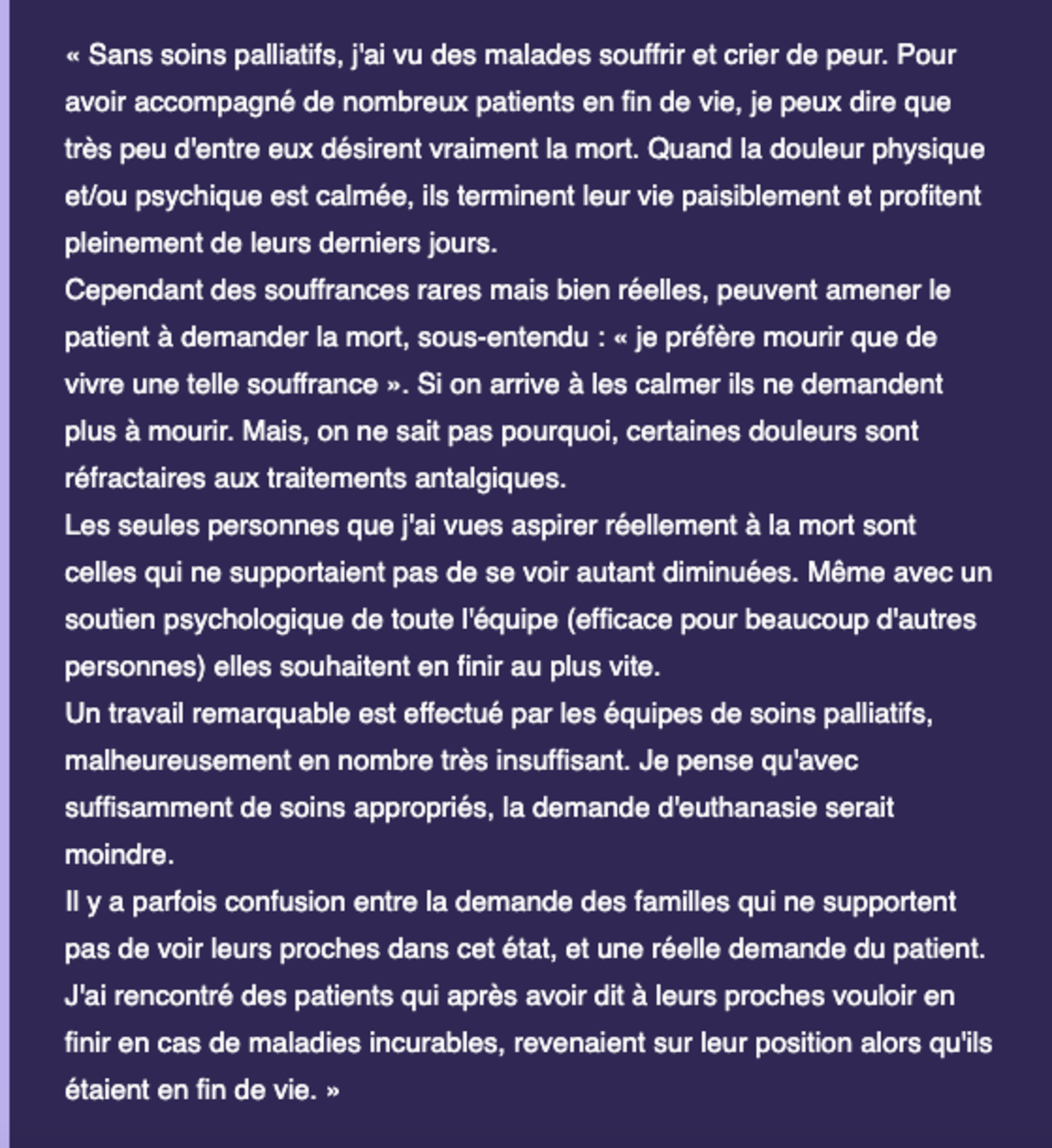 De nombreux soignants seraient réservés sur le droit à mourir (blabla et sondage), quelques-uns sans aucun doute comme le pense Michel pour des raisons religieuses, d'autres parce qu'ils considèrent serment d'Hippocrate oblige que ce n'est pas leur rôle. Les soignants qui ont répondu à notre appel - et que nous avons sélectionné dans ce florilège - sont plus nuancés. Ce n'est pas tant le refus du geste, que la crainte d'un glissement vers l'euthanasie "économique" dans un contexte de dégradation des services publics hospitaliers.