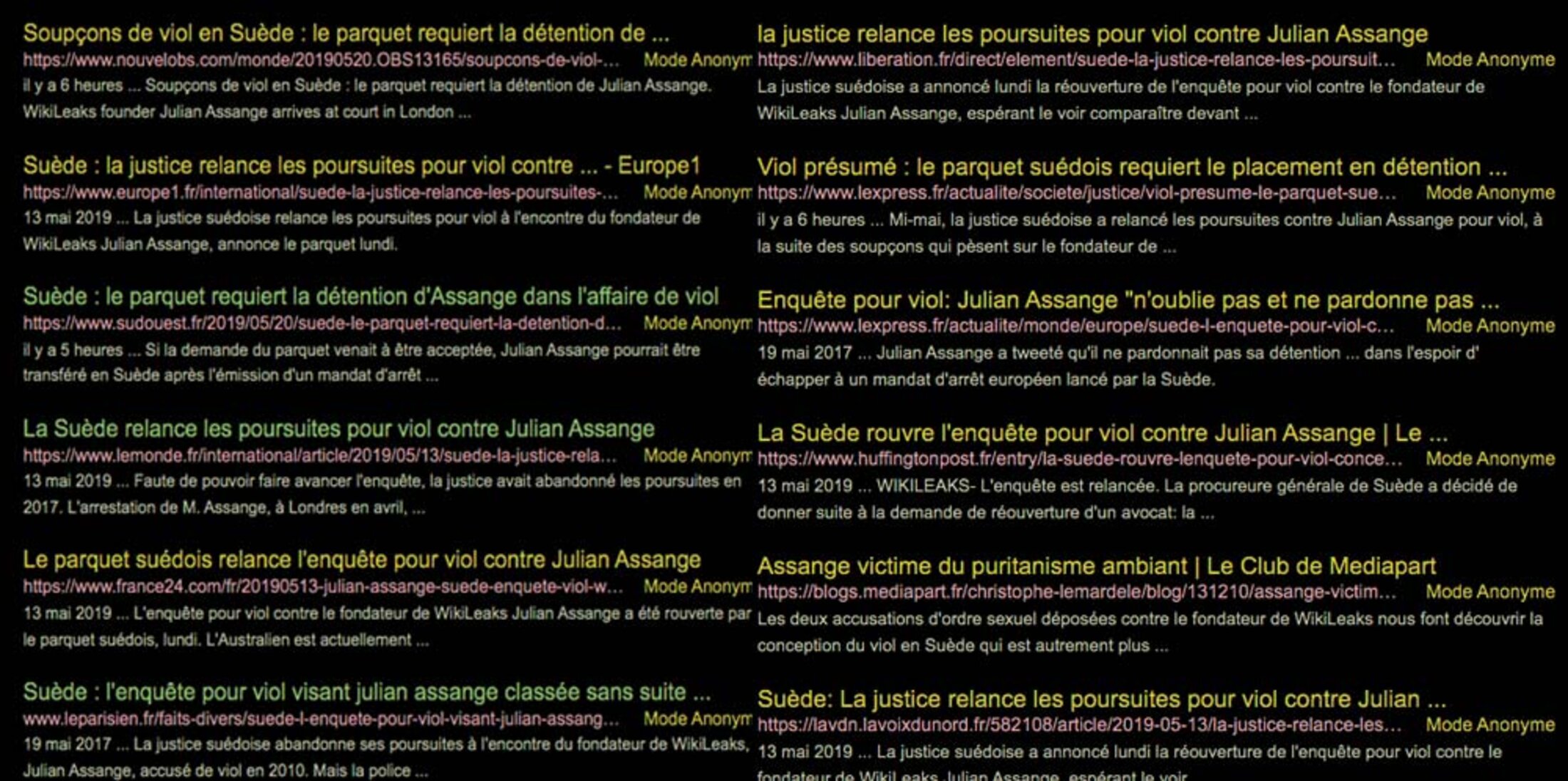 Et pour le florilège viol-Suède, l’image des pages 1&2 de recherche Startpage.com (on est pas des gogol quand même) parle d’elle-même, avec un salut au camarade du club mediapart étroitement cerné en page 2, « Assange victime du puritanisme ambiant » :
