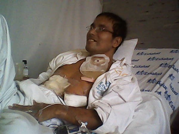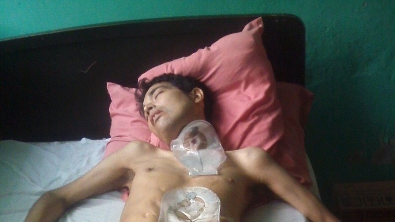 Habiendo perdido el estómago, el bazo, gran parte del hígado, con el esófago cortado y una fístula abdominal, además de desnutrición calórica (pérdida de más de 30 kilos de peso), es portador de una yeyunostomía, por la cual se le alimenta con Osmolite con una sonda. Esta condición delicada lo expone constantemente a infecciones y complicaciones que ponen en riesgo su vida.