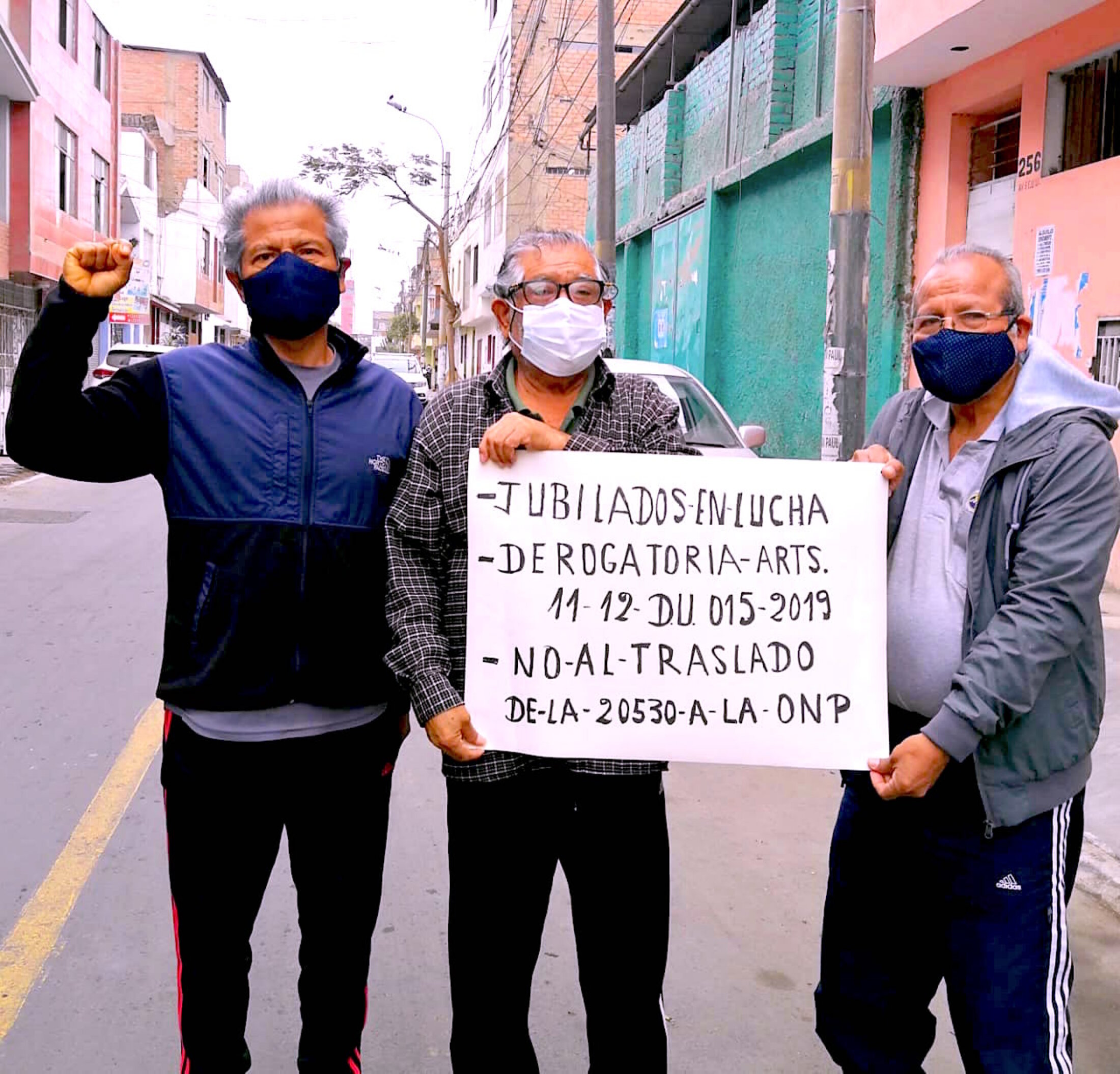Esta lucha de los pensionistas sigue hasta hoy día, después de que el 1ro de julio 2019, el Ejecutivo haya establecido el traslado obligatorio de pensiones a las AFP para profesores pensionistas. Hoy exigen la derogatoria de ese decreto, además de luchar por la vida y la salud. Piensan de hecho que la pandemia del COVID-19 ha logrado destapar la gran crisis del sistema de salud peruano y su proceso de privatización, y que está siendo utilizada para neutralizar la protesta social y para el exterminio de los ancianos, sinónimos de carga social, lo cual permite quitarles el derecho a la jubilación.