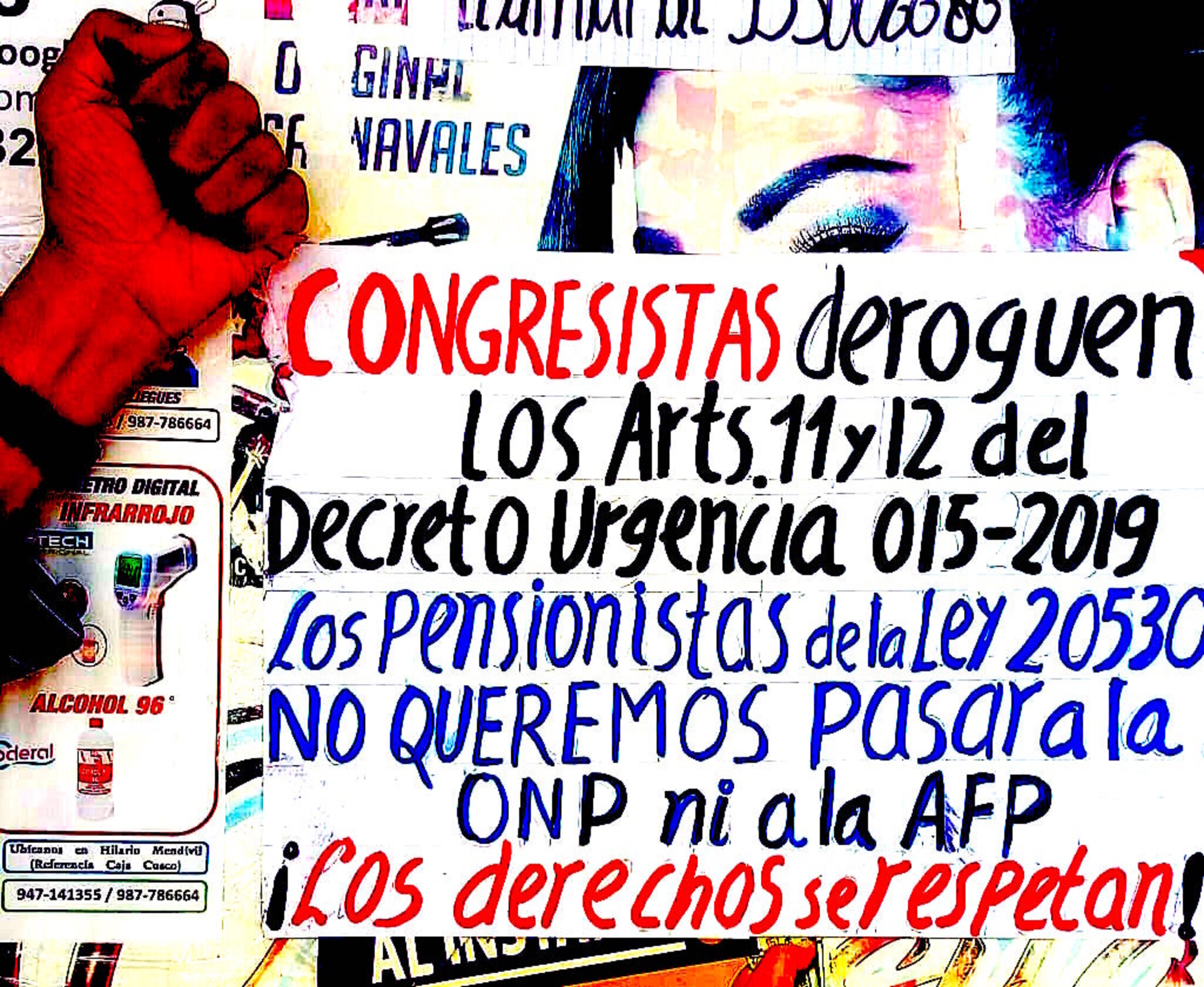 El actual Ejecutivo ha emitido el Decreto de Urgencia 015-2019, donde en sus artículos 11 y 12 busca trasladarnos de los entes ejecutores (ministerios) a la Oficina de Normalización Previsional (ONP), con la finalidad de reducir nuestras exiguas pensiones, perder los breves aumentos, pretender anular la deuda social, beneficios de escolaridad, viudez, orfandad, discapacidad de hijos. Nuestros derechos son irrenunciables, progresivos y no retroactivos, que con el Decreto Ley 20530 tenemos; por el contrario, merecemos la nivelación de nuestras pensiones como lo perciben municipales, policías, militares y ex funcionarios del gobierno, quienes cuentan actualmente con pensiones superiores a los cinco mil soles mensuales.