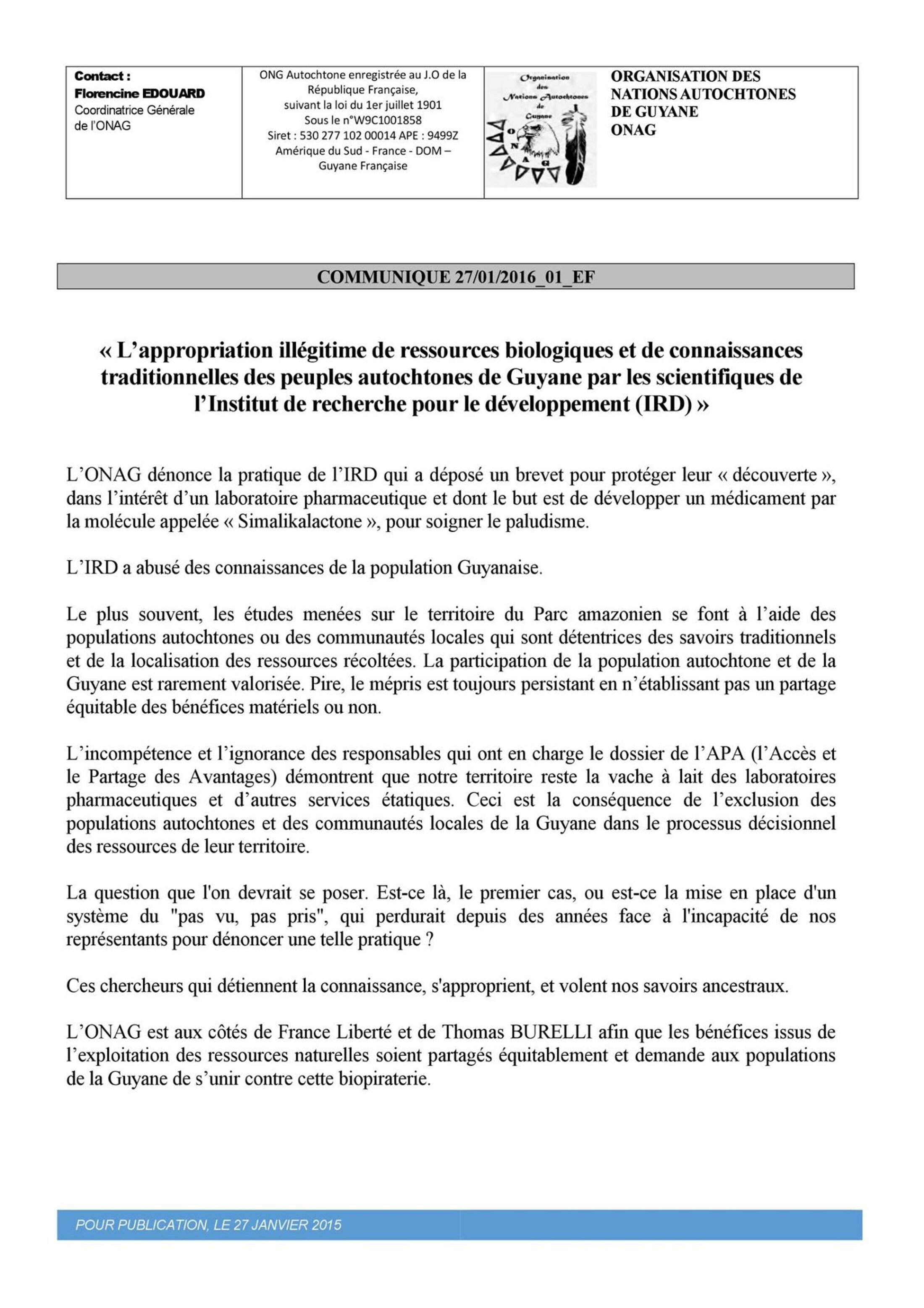 Le Communiqué du 27.01.2016 de l'Organisation des Nations Autochtones de Guyane (ONAG) dénonçant la pratique de prédation de l'Institut pour la Recherche et le Développement (IRD), sur ses savoirs ancestraux, à des fins de brevetages et de valorisations industriels au profit de laboratoires pharmaceutiques sans partage des avantages ainsi acquis. ET LA CONQUÊTE FRANÇAISE DE L'AMÉRIQUE EST SANS FIN