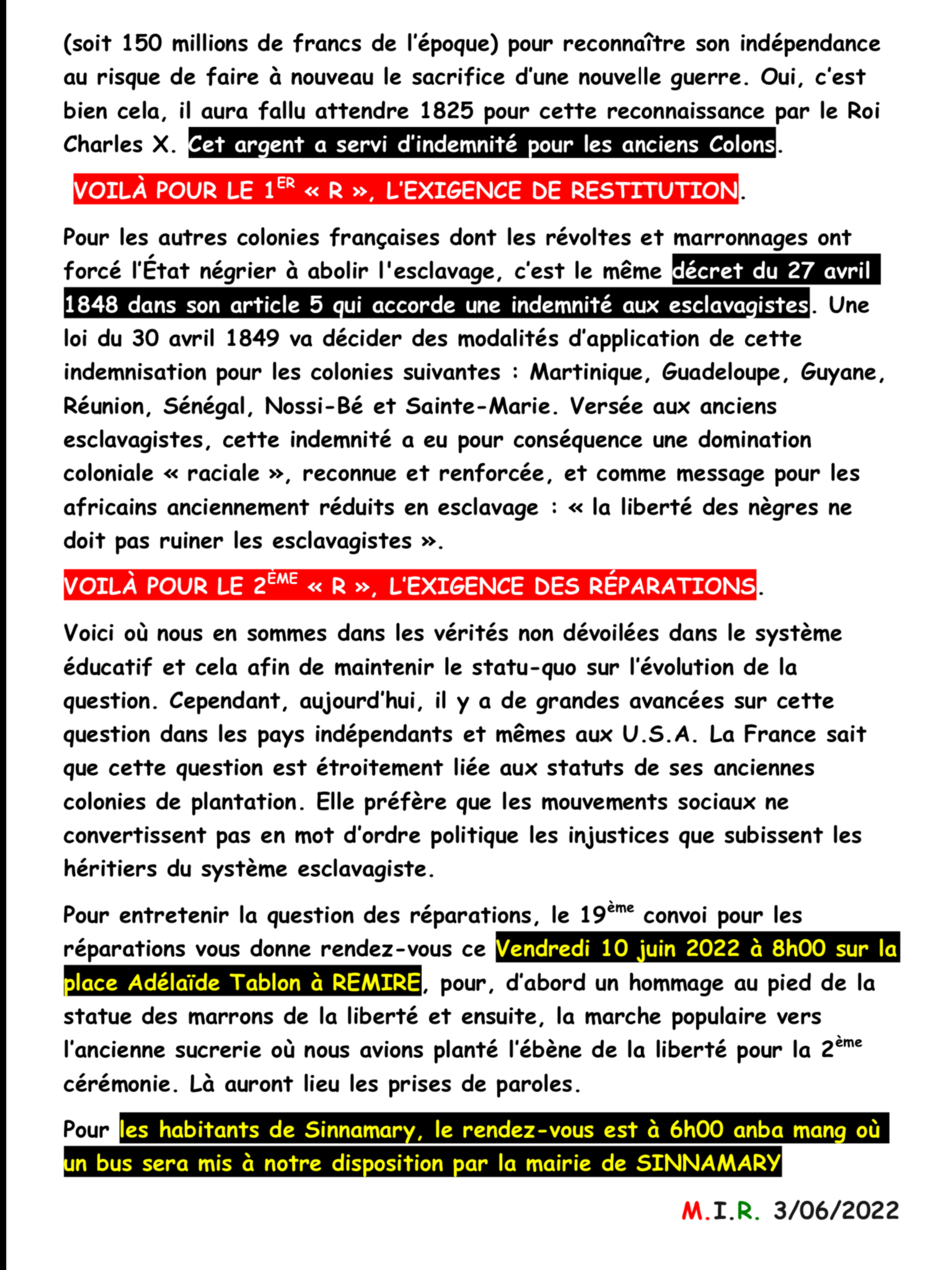 Pour entretenir la question des réparations, le 19ème convoi du MIR-Guyane vous donne rendez-vous ce vendredi 10 juin à 8h sur la place Adélaïde Tablon à Rémire, pour d’abord rendre hommage au pied de la statue des marrons de la liberté et ensuite, la marche populaire vers l’ancienne sucrerie où nous avons planté l’ébène de la liberté pour la 2ème cérémonie. Là auront lieu les prises de paroles.
