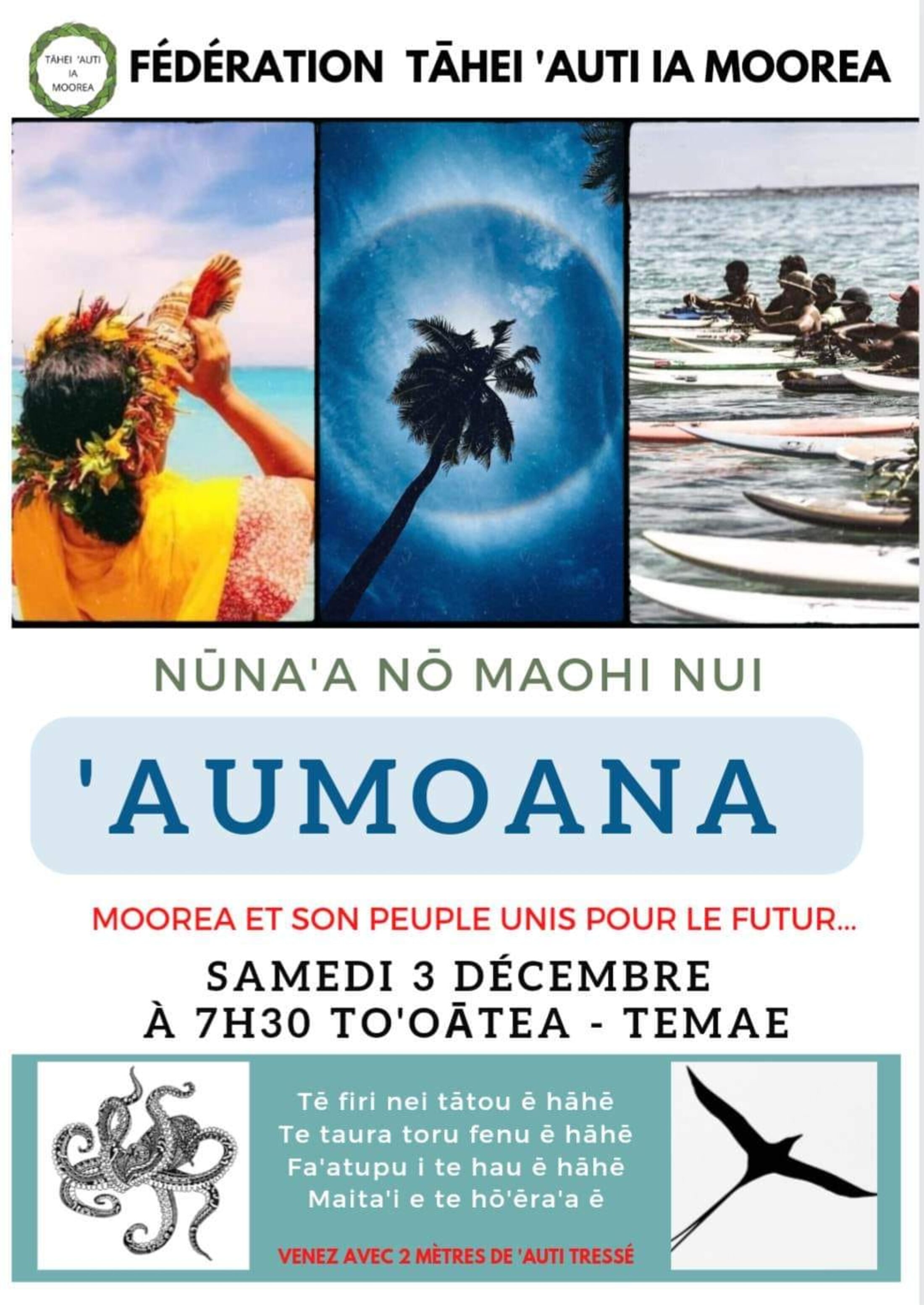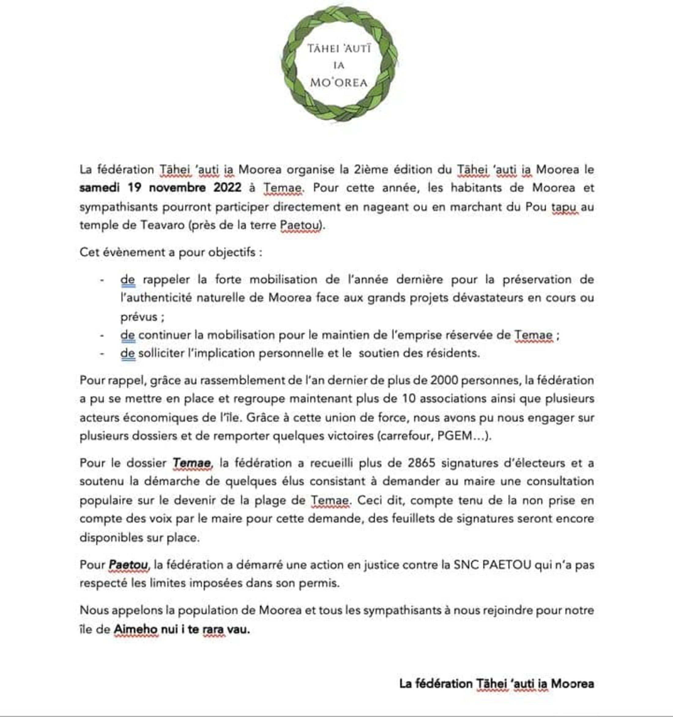 Emmenée par son président Rahiti BUCHIN (enseignant) qui évoque, parallèlement aux multiples enjeux à défendre, le travail de fond de Tāhei ˋAuti Ia Moorea, comme le recueil de signatures, la demande de consultation populaire pour les habitants de Temae et le combat mené au tribunal contre les remblais sauvages de la SNC Paetou avec demande d’étude d’impact, la fédération augmente significativement ses liens de protection tout comme l’étendue de son unanimité.