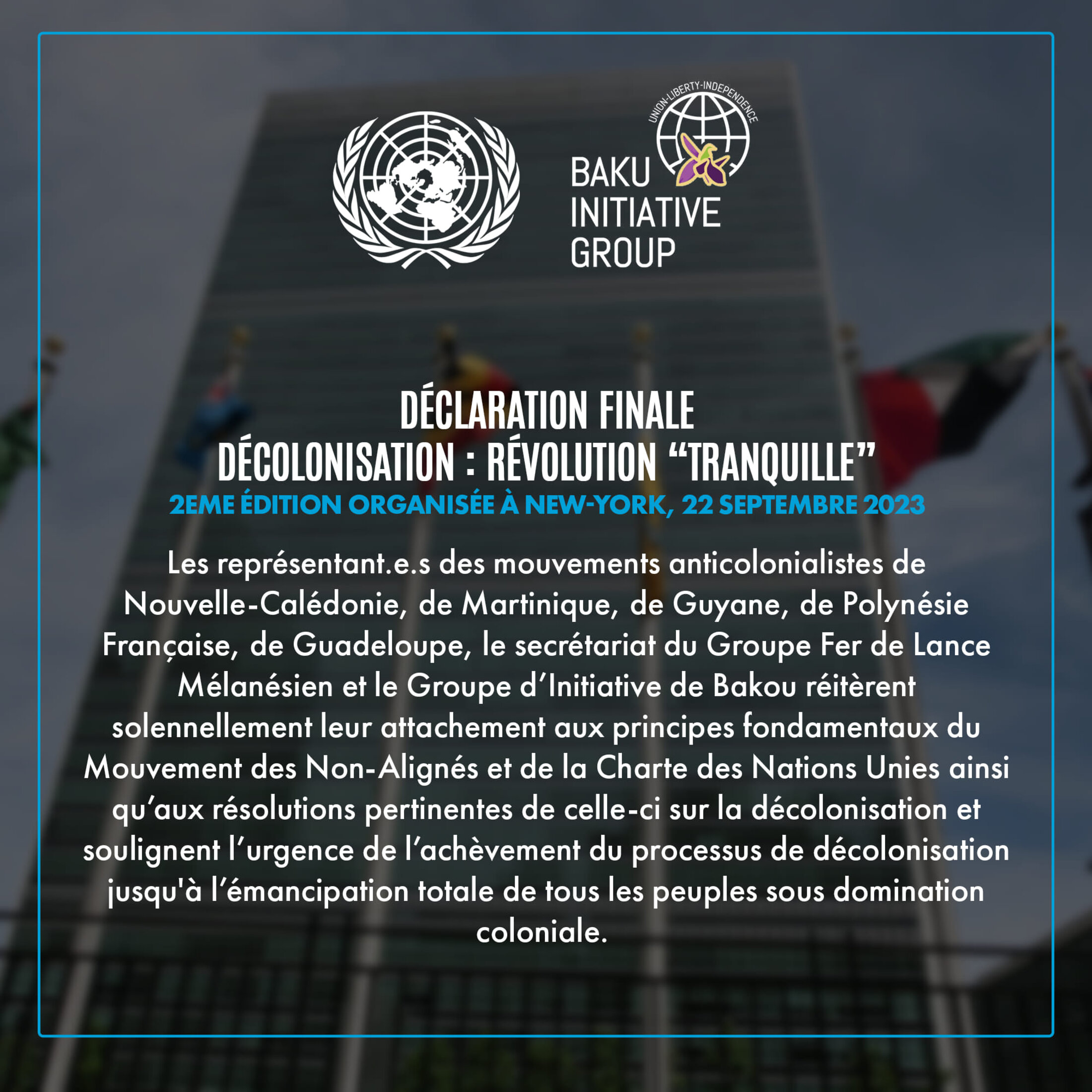 Les représentant.e.s des mouvements anticolonialistes de Nouvelle-Calédonie, de Martinique, de Guyane, de Polynésie (Française), de Guadeloupe et le Groupe d’Initiative de Bakou réitèrent solennellement leur attachement aux principes fondamentaux du Mouvement des Non-Alignés et de la Charte des Nations Unies ainsi qu’aux résolutions pertinentes de celle-ci sur la décolonisation et soulignent l’urgence de l’achèvement du processus de décolonisation jusqu'à l’émancipation totale de tous les peuples sous domination coloniale.