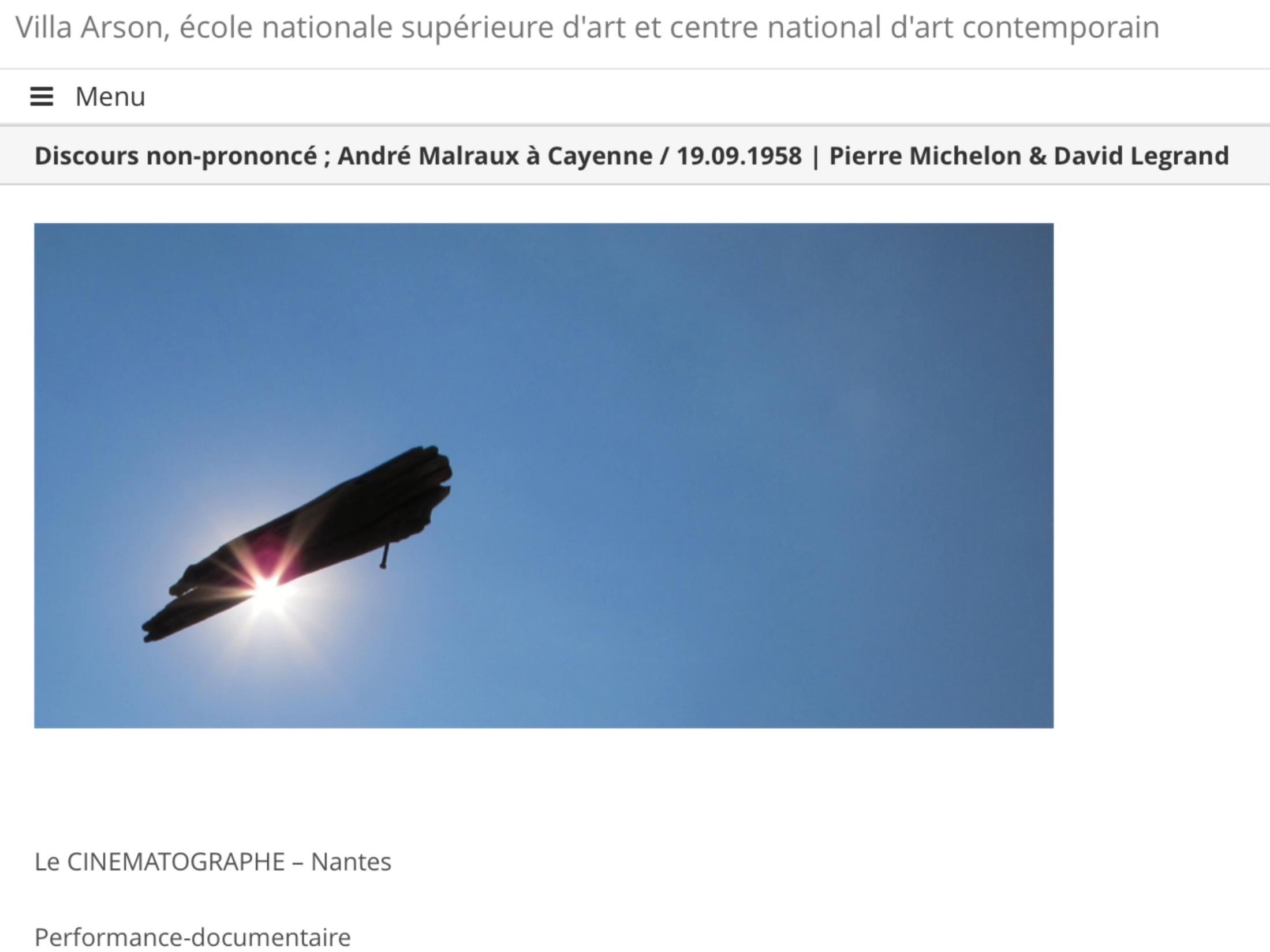 La mise au grand jour de ce document retrouvé par Pierre Michelon à la bibliothèque littéraire Jacques Doucet qui détient tous les manuscrits d'André Malraux, et la reconstitution intégrale tout à fait remarquable de ce discours, qu’on lui empêcha de tenir sur la Place des Palmistes le vendredi 19 septembre à Cayenne, autrement dit sa fabrication documentaire, fût augmentée de la performance documentaire de David Legrand qui incarnait le timbre menaçant, le rythme vociférant et nasillard de l’homme que le Général de Gaulle nomma dans un premier temps de reconquête de l’Amérique Ministre délégué à la Présidence du Conseil, chargé de l'information.