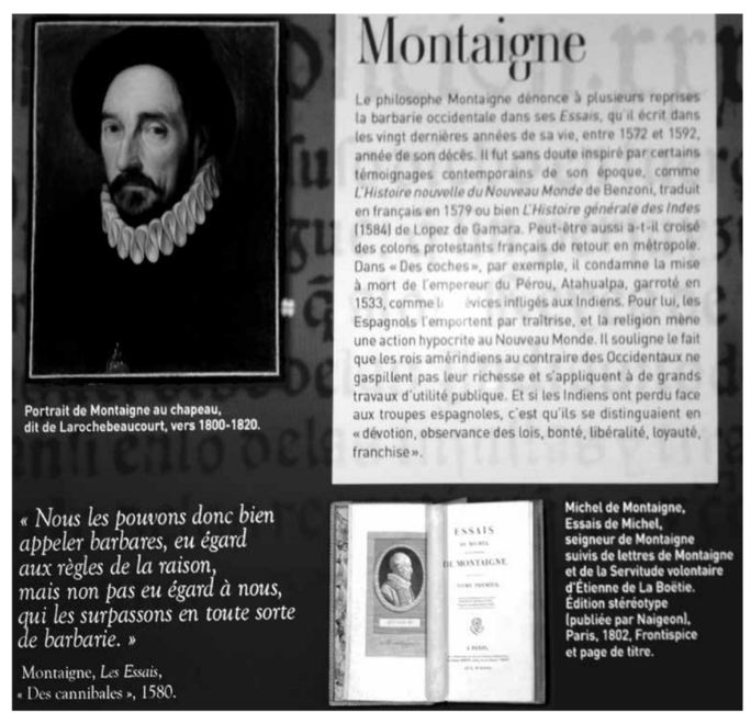 Contrairement à ce que le Mémorial ACTe induit, MONTAIGNE écarte radicalement la France des exactions colonisatrices, et les attribue aux seuls Espagnols et Européens face aux Amérindiens du continent sud-américain. D’autre part, MONTAIGNE n’a jamais parlé ni de la traite des Noirs ni du process de leur mise en esclavage, et s’est juste limité à s’offusquer mollement en quelques lignes du sort réservé aux Amérindiens du continent américain sous la main hispanique. Il n’a donc jamais évoqué le traitement que les Français réservèrent aux Amérindiens dans leur colonisation du Brésil qui débuta en 1520, et qui se densifia en 1530 quand, entre autres colonies, Pierre du PÉRET consolida la colonie d’Henryville située dans la baie de Rio, avant que plus tard les attaques portugaises ne missent ces colonies françaises en échec2. Ni MONTAIGNE ni aucun autre Français n’opinèrent sur le rôle colonialiste majeur de la France, avec la flibuste qui pour constituer la marine militaire du royaume (et elle en fut dépourvue jusque vers la fin du XVIIIe) opérait sur un mode mercenaire. Nul ne se prononça sur son intervention qui tenait particulièrement à attaquer les galions ibériques et à les dépouiller de tout l’or qu’ils avaient spolié aux Amérindiens, ce qui évitait ainsi à la France de perdre nombre d’hommes dans ses conquêtes comme de financer toute la logistique marine et colonisatrice fort onéreuse. Ainsi par exemple entre autres nombreux exemples, en 1534 François Le CLERC assaillit et incendia Cuba en la dévalisant de ses trésors, puis en 1554 il récidiva ses forfaits à Cuba où il s’empara d’un énorme butin en La Havane. Successivement, les rois de France anoblissait ces flibustiers qui réussissaient leurs exploits coloniaux, comme quand en 1551 le roi Henri II anoblit François Le CLERC pour le récompenser de ses forfaits génocidaires, ou encore quand en 1523 fut anobli Jean FLORIN qui avait très amplement dépossédé les Hispaniques. Aucun penseur ne parla jamais d’une France qui dès 1510 fournissait des esclaves Noirs aux Espagnols, d’autant qu’elle avait déjà colonisé à cette date plusieurs zones de la côte ouest-africaine où était entrepris l’extractivisme de ses matières précieuses et l’odieux trafic des hommes, femmes et enfants.