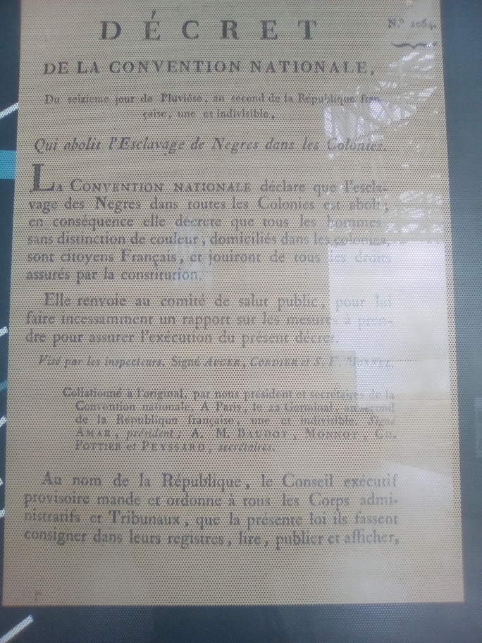 Le Mémorial ACTe est conformé par l’identité républicaine d’une France continentale et Blanche, qui oublie que les rebellions d’esclaves, et celles de certains Libres de couleur menées sous d’autres formes à partir de leurs positions sociales particulières, forcèrent autant la première que la seconde abolition de l’esclavage. À titre d’exemple à l’extérieur du musée, le Mémorial ACTe appose en tout premier panneau le décret de l’abolition de l’esclavage (Photo 5 et 6), qui, en imprimant la notion d'abolition avant même d'imprimer celle de l'esclavage, appauvrit excessivement son champ historique.