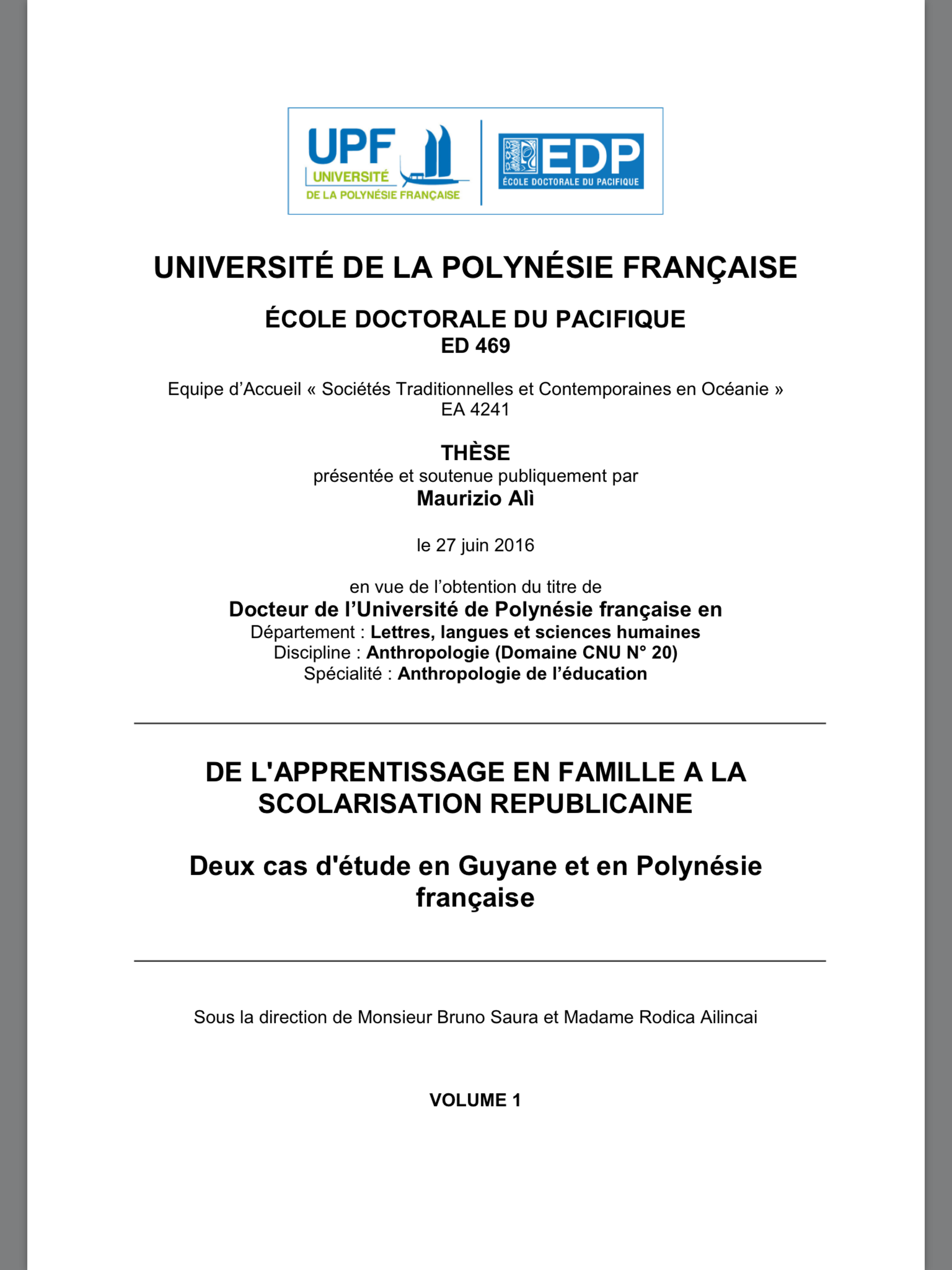 Thèse, océanique transverse, soutenue par Maurizio ALI de l'Université des Antilles (Guadeloupe). Une extraordinaire contribution au rapprochement critique de la pédagogie et de l'échec actuel de l'école néocoloniale républicaine et laïque (du Ministère de l'Ėducation Nationale) sur l´Hexagone des océans français, chez les Amėrindiens Wayana - Apalaï de Guyane, et chez les Enata des Îles Marquises
