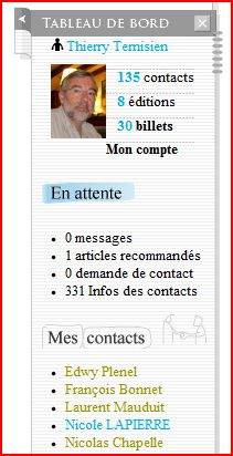 Les 135 contacts, pour la majorité sollicités par moi (demande de contact), me permettent, mieux que tout classement, d’accéder par la fonction Infos des contacts aux articles et billets de blog auxquels je n’aurai pas accédé de moi-même.