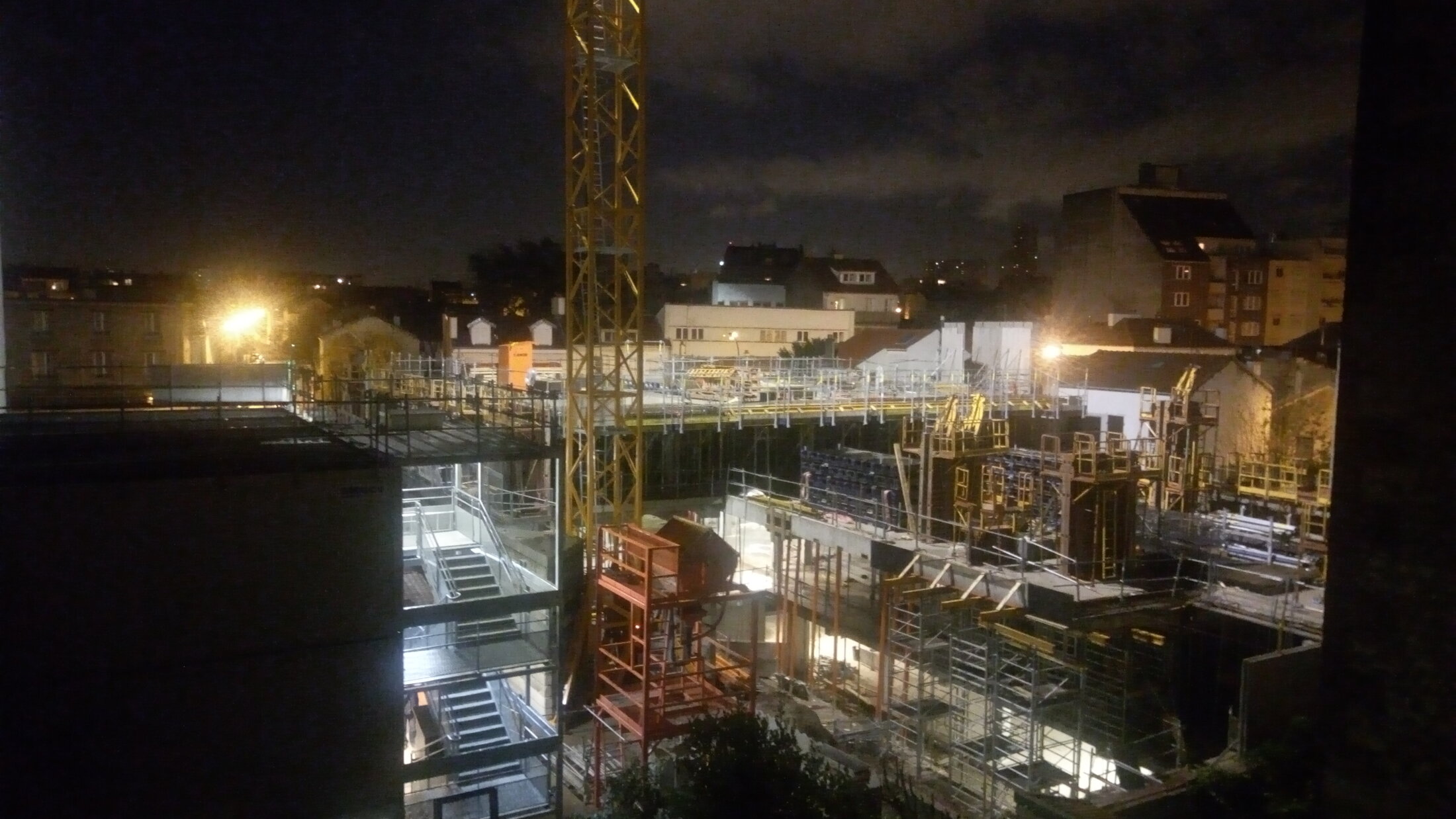 L’orage a fait du mur de béton brut un miroir d’eau. Lissé liquide, il luit sous le soleil revenu. Avec ou sans casque, les ouvriers réapparaissent sur l’échafaudage. La grue pousse son long bip puis lentement pivote entre les gros nuages blancs. La vie revient avec l’accalmie.
