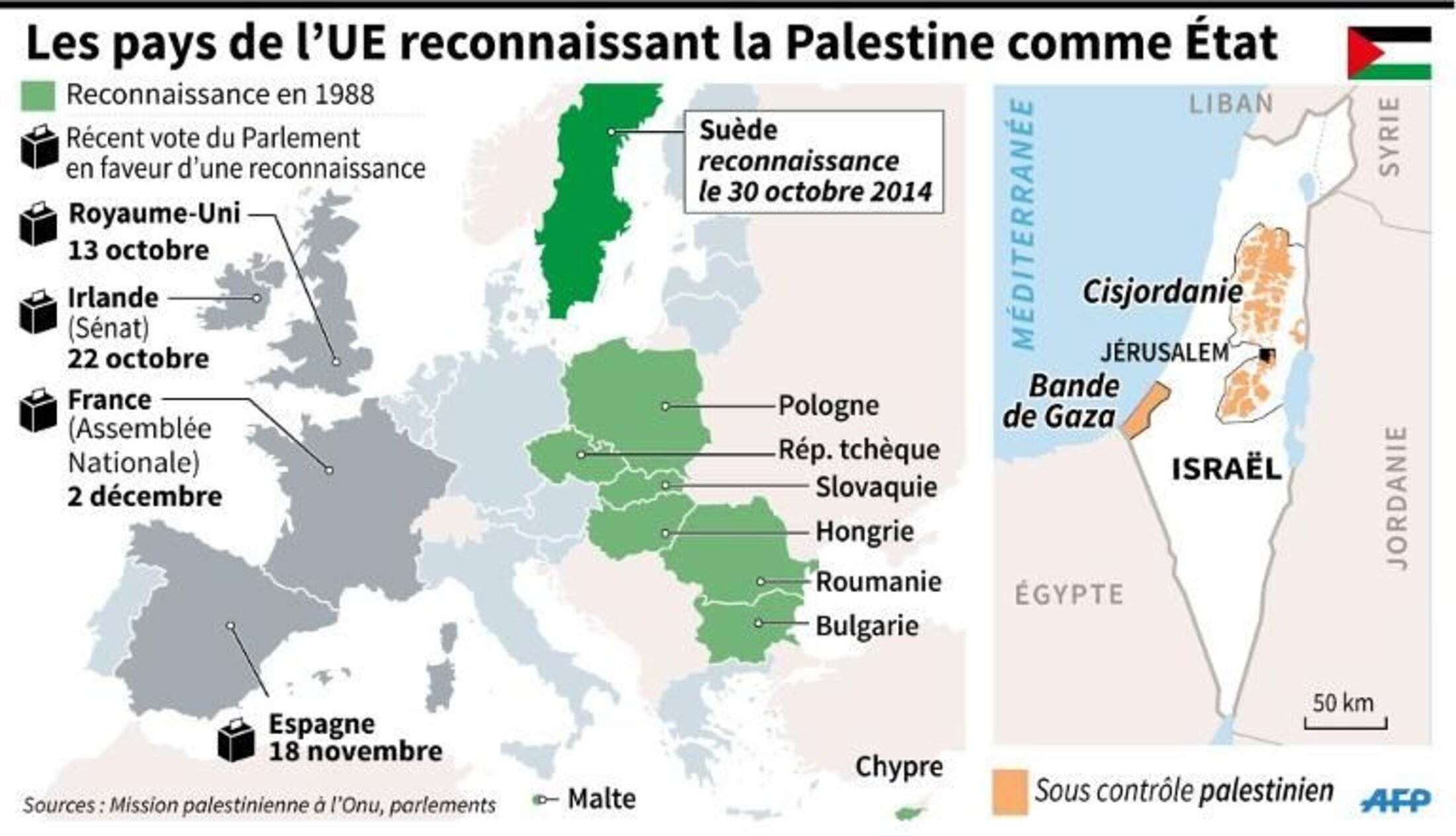 En décembre 2014, le Parlement français avait adopté un projet de résolution non contraignant « invitant » la France à reconnaître la Palestine. En novembre, c’était les députés espagnols qui avaient adopté une motion appelant le gouvernement à reconnaître la Palestine en tant qu’État. En octobre, la Suède devenait le premier pays de l’Union européenne à reconnaître l’État de Palestine.