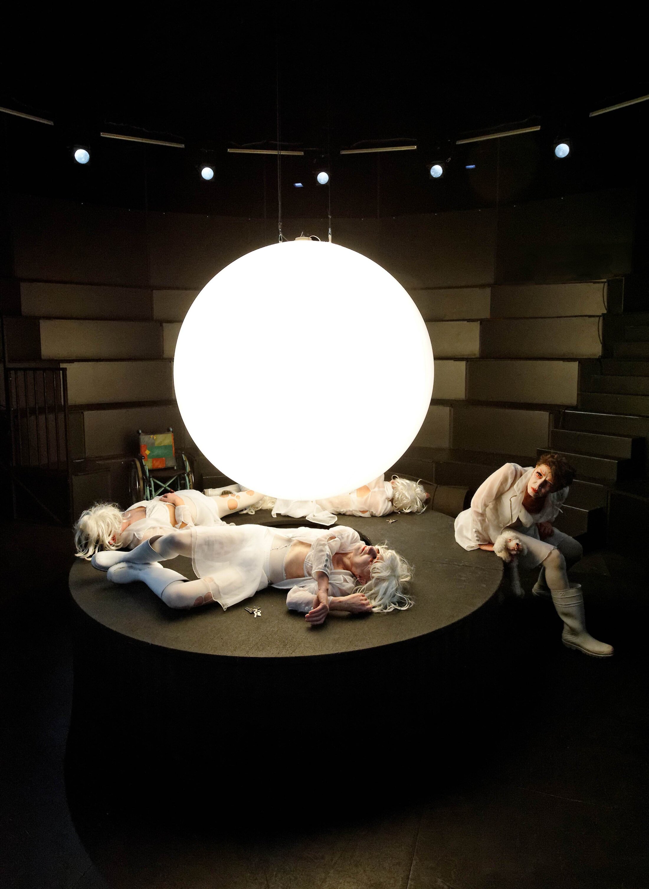 Les spectateurs sont placés en gradins dans une petite arène, littéralement collés à la scène. Tout en perruques blanches, faux cils et lèvres fardées, Leila (Georges Edmont) et Maria (Marc Mérigot) s’extirpent d’une boîte, caveau pour morts-vivants. Vieilles folles junkies, elles sont rejointes par Joséphine (Claude Degliame) et Fougère ( Christophe Sauger) pas mieux loties.