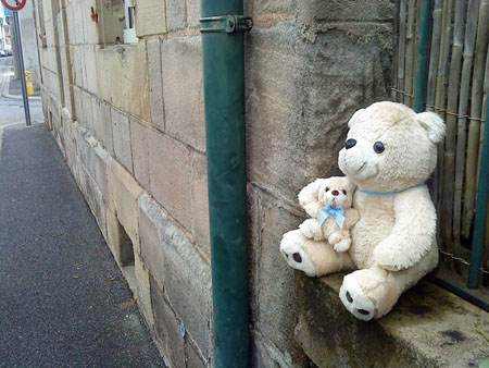 Depuis trois jours, sur le chemin du travail, je croise un ours. Matin et soir, il est là, dressé sur son séant, une patte tenant fermement un ourson sur son flanc et un sourire affiché qui ne faiblit pas. Sur le petit muret, il attend. Et sa constance interpelle les passants qui lui sourient à leur tour sans oser l’approcher.