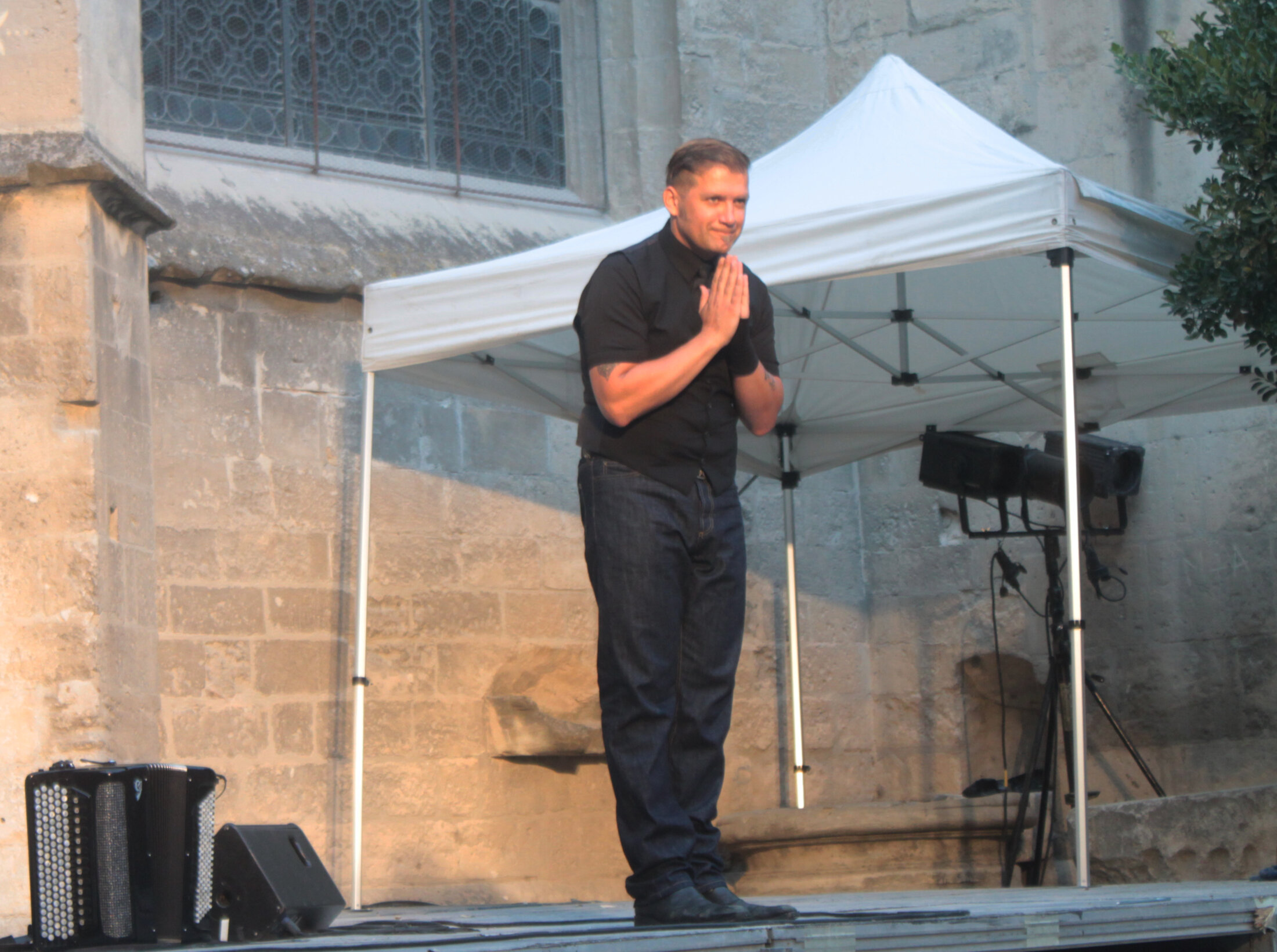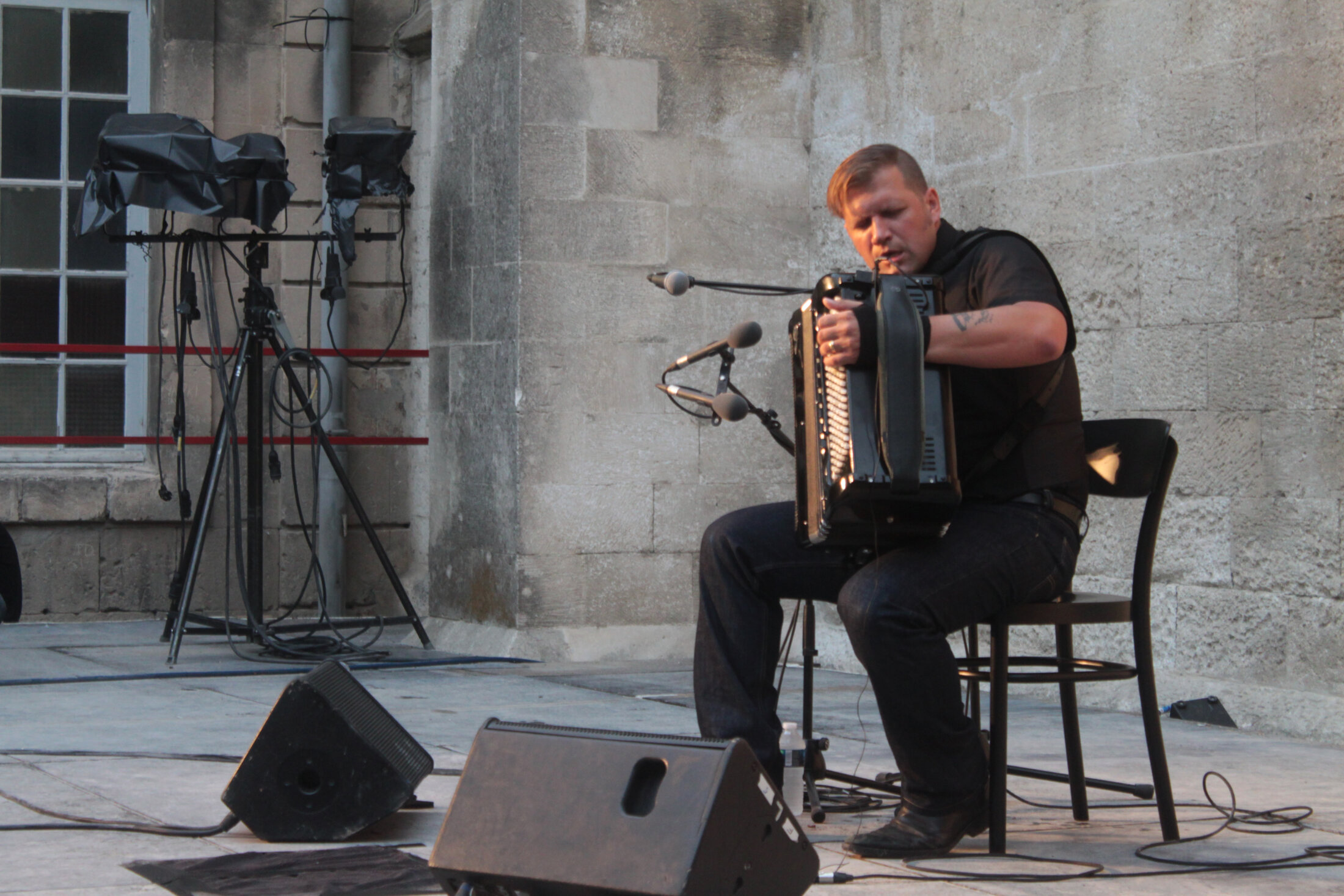 Ce soir, il accueille le public d’un large sourire, le salue humblement. Il s’assoit et s’harnache de son imposant instrument. Déjà, le son de ces gestes est musique, on sent la vie parcourir les touches, les soufflets et les bretelles. De ses doigts il fait jaillir un souffle vital, un rythme cardiaque vivace mais sain. Il joue sur les fréquences, les soustrait, les additionne. Tout son corps suit le rythme imposé aux mécaniques. Il ressemble à un coureur cycliste qui vainc les cols et les montagnes, jouit des descentes et réveille les faux plats.