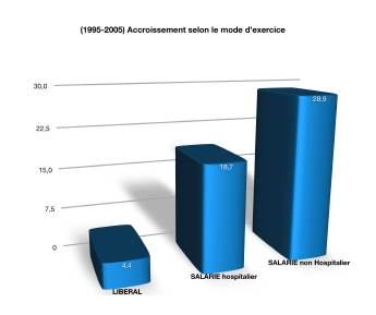 La progression du secteur salarié est 6,5 fois plus forte que le secteur liébral: +4,4% pour le secteur libéral, +18,7% pour les salariés hospitaliers, 28,9% pour les salariés non hospitaliers.