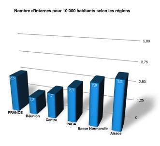 Au niveau de la formation et du nombre d'internes par région (densité des internes par tranche de 10 000 habitants) il y a de fortes disparités qui montre bien que le nombre d'interne est déterminé à partir des besoins des CHU et non des besoins saitaires des populations !