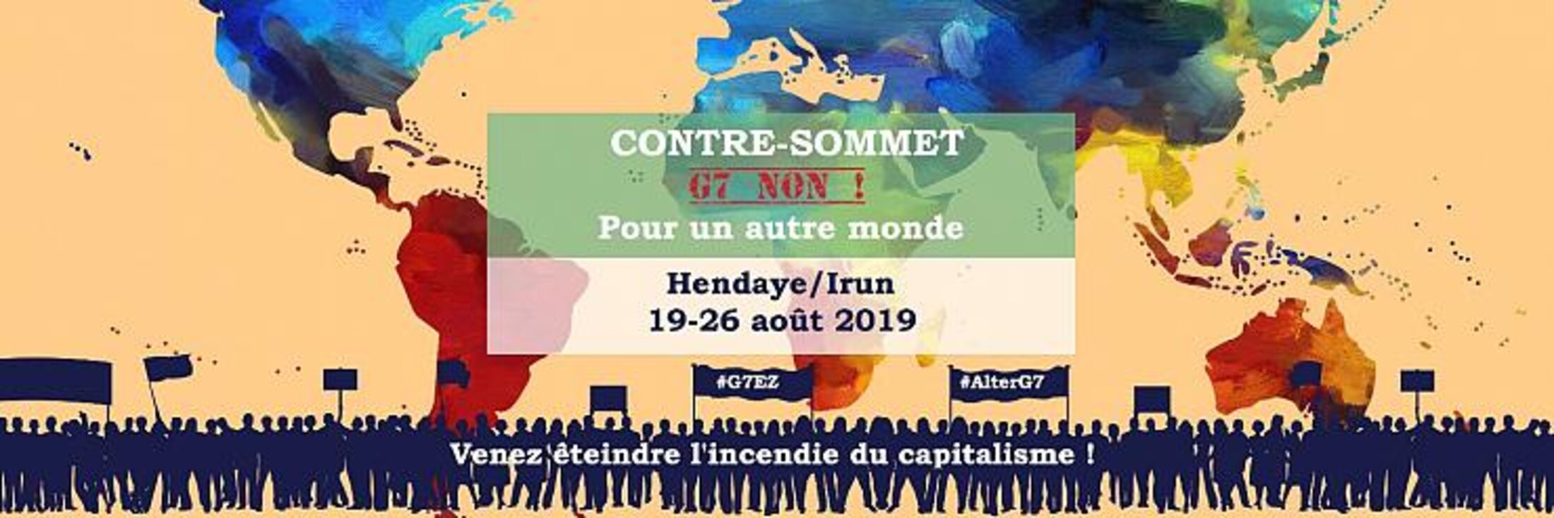 La plateforme G7 EZ ! a été créée en novembre dernier par une multitude d’acteurs du Pays Basque (associations, syndicats, partis et mouvements politiques) autour d’un appel commun contre le G7 et son monde. Elle prévoit plusieurs mobilisations à partir du 19 août à Hendaye et Irun, qu’elle organise en partenariat avec la plateforme hexagonale Alternatives G7.